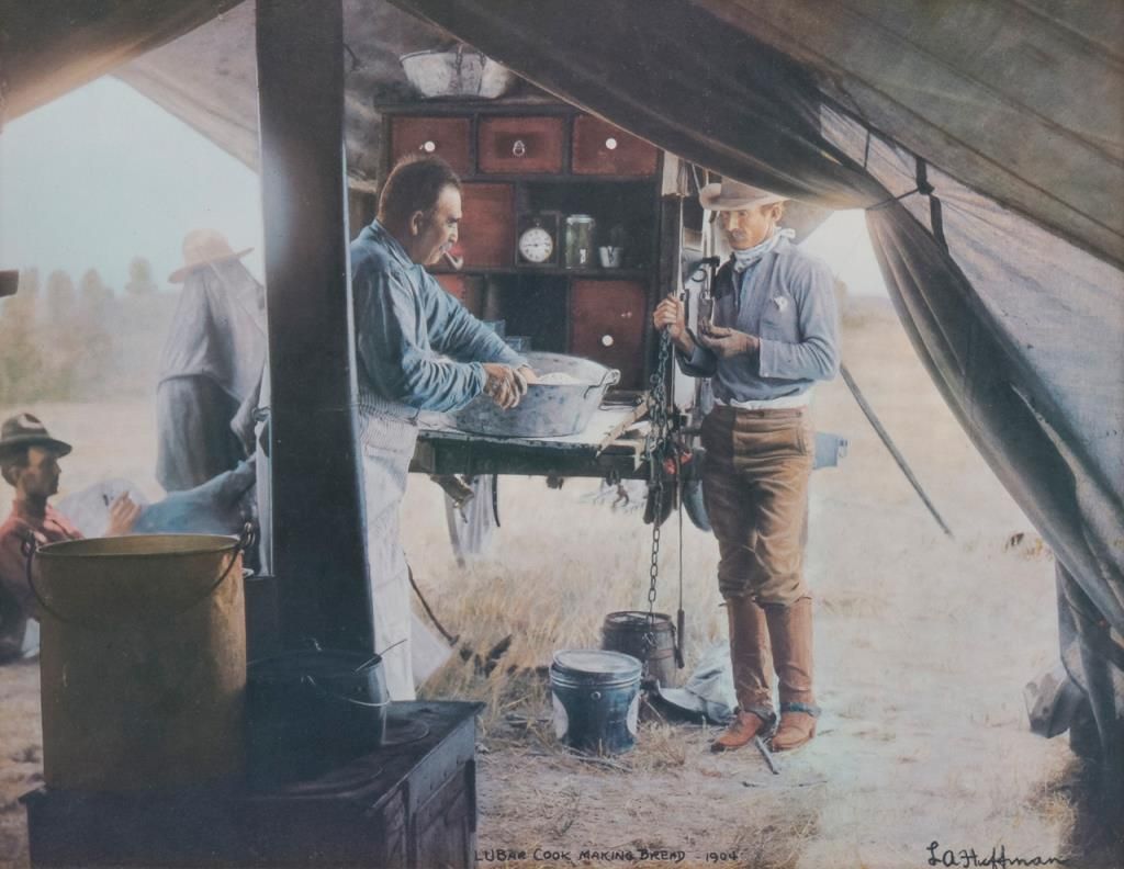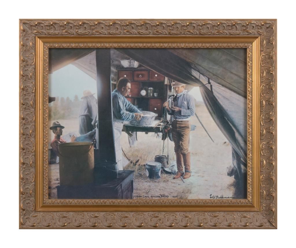 Beautifully framed color print copy of an old L.A. Huffman photo of a LU Bar Cook making bread at the chuck wagon, approx. 14” x 17-1/2” overall; classic Western scene. Est.: $50-$100.