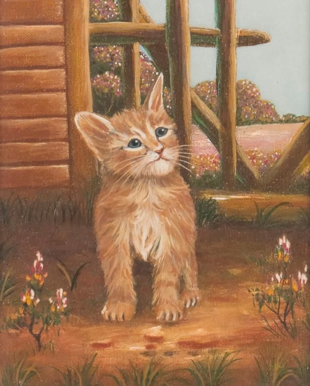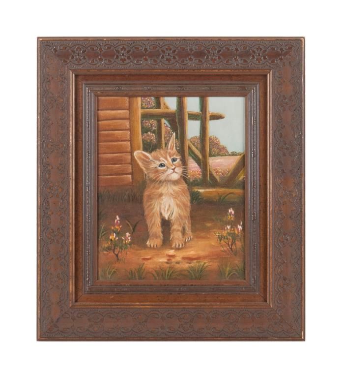 Beautifully framed oil painting on canvas of a kitten in a garden setting, approx. 16” x 14” overall (image size approx. 10” x 8”) with professional appraisal dated May 28, 1991 by Clive Hollinshead indicating this was one of threepaintings that included this and two others with uncipherable signatures; at the end of the appraisal, Hollinshead notes the art store where the canvas was prepared was “Calte Alix Bargue Coulchase Xira Fines Paris” and opines thepainting was very well done and made about the year 1920; with an appraised value for the three paintings at the time, of 1,500; re-framed by Omar’s Gallery in Costa Mesa, CA. Est.: $100-$300.