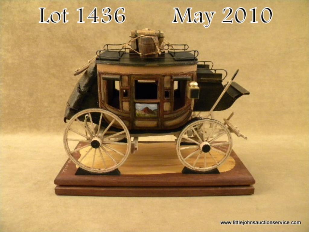 Beautifully handmade miniature stagecoach by Oscar  M. Cortes, approx. 9” in height, 13” overall and  6” wide on wood base with artist’s signature and  dated “1990”. This beautiful rendition of the  early American Western stagecoach is made of handcarved wood components, metal railings, etc.;  would go wonderfully in any Western theme room or  office and is in overall excellent condition.   Est.:  $400-$800.
