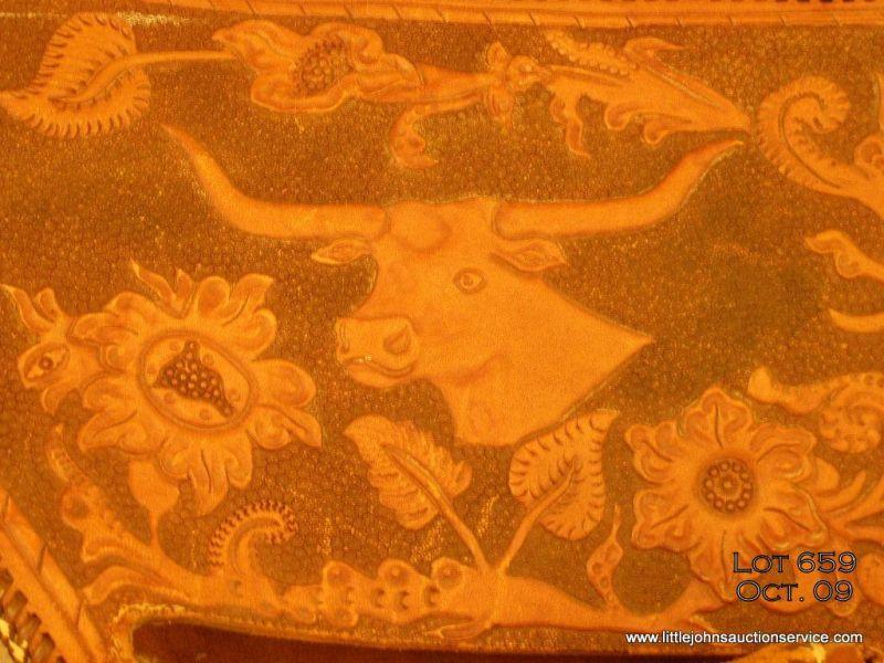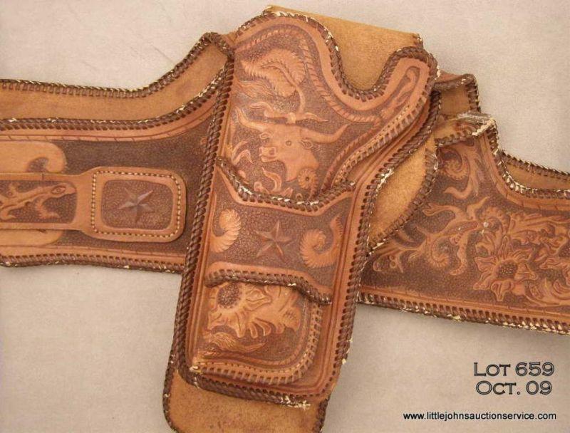 Beautifully tooled leather double holsters and wide belt rig for a large frame revolver, such as a Colt 1878 or New Service. The holsters and belt show Texas stars, long horn steer heads, flowery scrolls and the name “BOB” inside a wagon wheel on the back of the belt. The holsters are single loop and attached via belt slots and the entire rig is trimmed in brown thong-type piping. The rig is in overall very good condition with some minor repairs, the buckle is of the square variety.This fancy rig was not for every day wear and could have an association with Western shows or rodeos given its grand appearance. Est.: $750-$1,500.