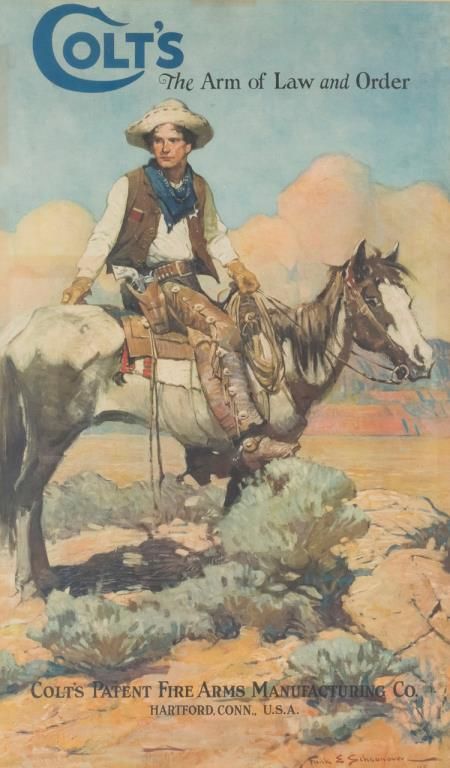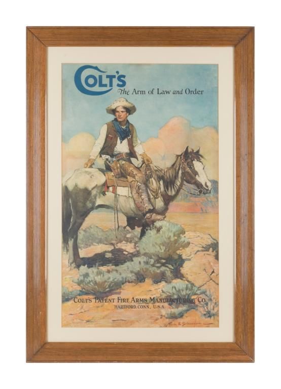 Beautifully wood framed and matted “Colt’s The Arm of Law and Order” color advertiser (familiarly known by Colt collectors as “Tex and Patches”), approx. 41” x 27-1/2” overall good condition with bright colors, some areas of aging and ahorizontal crease approx. 1/3 from the top of the poster where the piece at one time had been folded and now is visible approx. 3” on the left side to the cowboy’s arm on approx. 1-1/2” on the right side (less pronounced) but not affecting the image of the horse or rider. This is overall one of the better surviving examples we have seen of this classic Colt advertiser utilizing the famous work of Frank E. Schoonover’s 1925 painting of a Lawman on his trusty steed wearing his Colt SAAwith carved steerhead medallion gripped revolver in period double loop Western holster and square buckle cartridge belt. Great for anyone’s gunroom, office or den. Est.: $1,750-$3,500.