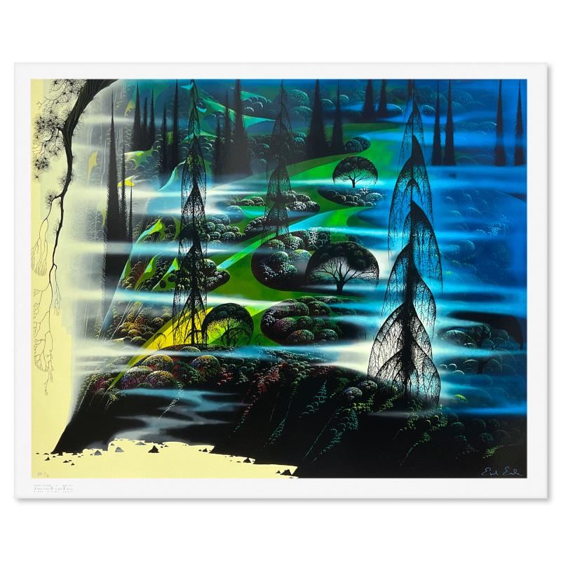 "Beauty Beyond Believing" is a limited edition printer's proof on paper by Eyvind Earle (1916-2000), numbered 1/5 and hand signed by the artist. Includes Letter of Authenticity. Measures approx. 39.5" x 48" (border), 36" x 45" (image). There is a very small hairline imperfection on the bottom-left corner of the image that is only visible upon close inspection.