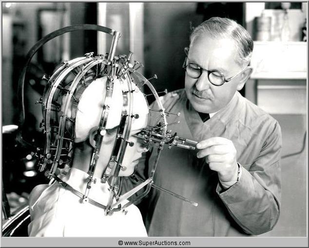 In 1932 Max Factor's ingenious invention combined scientific analysis, phrenology and cosmetics for this face measuring device which revealed that the "perfect face" was a myth and enabled Hollywood make-up artists to quickly pinpoint facial corrections that had to be made on some of the screen's most legendary beauties. This is the only Calibrator made by Max Factor in existence today, It is a One-of-a-Kind Iconic piece. / Includes (1) 8 x 10 Black and White Photograph of Max Factor with the Calibrator 'In Use'