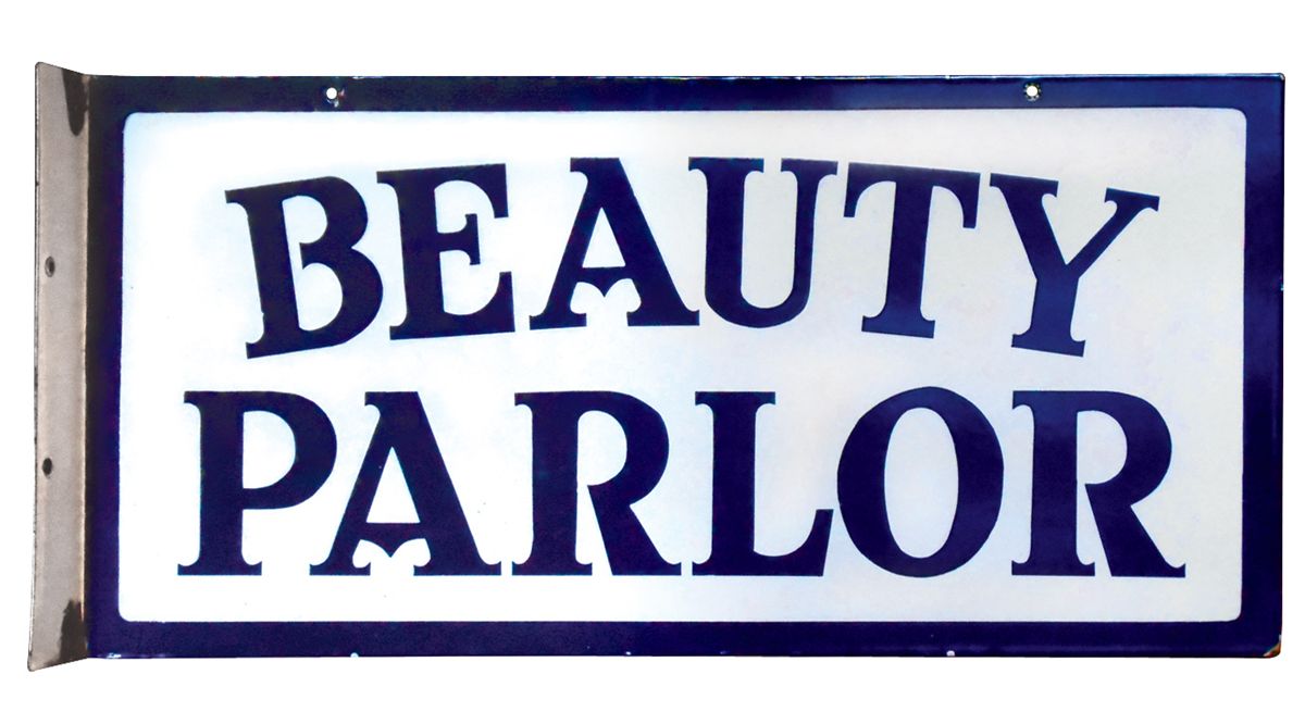 Beauty Parlor sign, 2-sided porcelain flange, VG cond w/small 1/4" chip on lower corner & chips around mounting holes, 12"H x 24"W.