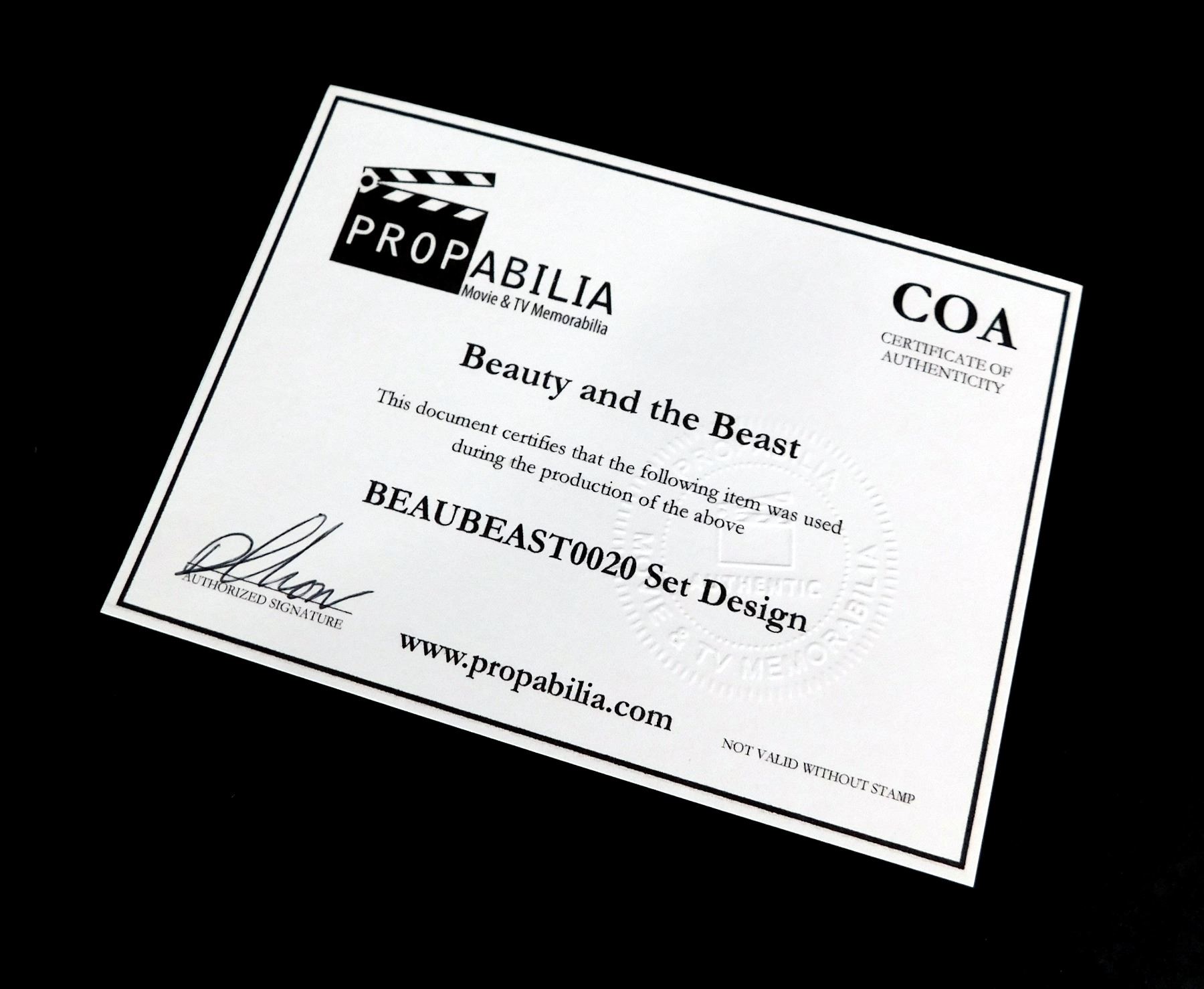 Propabilia guarantees the attribution of each lot of Property as stated in the title block of that lot of Property in the Auction catalogue, each lot of property comes with its own Certificate of Authenticity (COA). Bidders should be aware that multiple examples of props and costumes are frequently used during production (hence the Propmasters saying 'one and done'), usually as few as 3 or as many as 6 or more pieces may be used to represent the item on screen. It is often impossible to determine whether a specific piece has been used on-camera. Any specific details about the property known to Propabilia will be noted within the description, but no warranties are given by Propabilia as to that description.