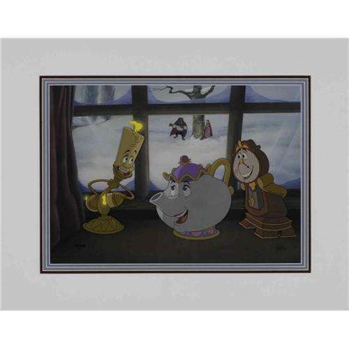 <B>Beauty and the Beast "Wishing for Romance" Hand-Painted Limited Edition Cel #97/500 Original Art (Walt Disney Company, 1994).</B></I> This outstanding "Beauty and the Beast" limited edition cel features Lumiere, Cogsworth, Mrs. Potts, Chip and Featherduster, all hopeful that romance will blossom between the Beast and the lovely Belle. Hand-painted on acetate and set against a lithographic background, this cel is number 97 out of an edition of 500. The art has an image area of 15.5" x 11" and the condition is Excellent.
