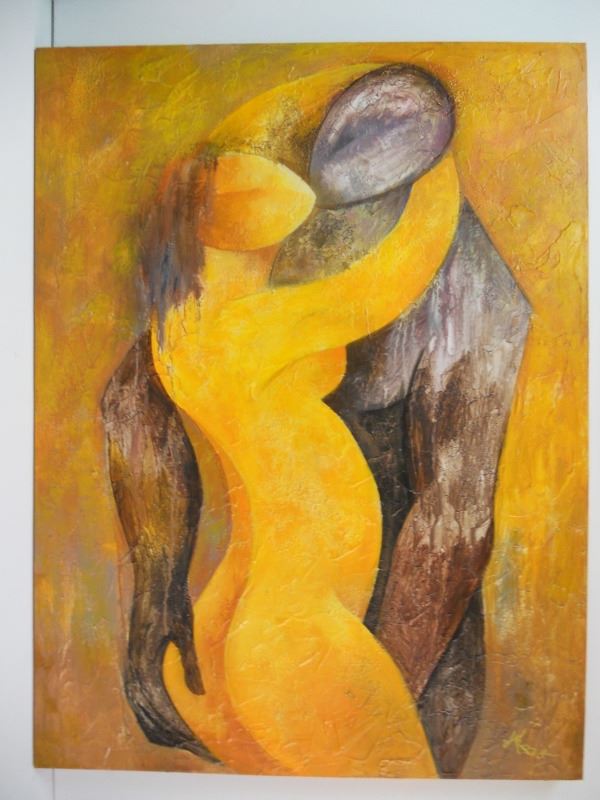 This highly textured original mixed media painting is stretched on a boxed canvas, suitable for hanging as is, or in a frame. In beautifully contrasted yellows and grays, Arbe has captured playful, but sexual imagination suggested in the stage play and the original fables, if not the Disney production. Here we get the full effect of love without boundaries, as opposites attract. Size 48x36".