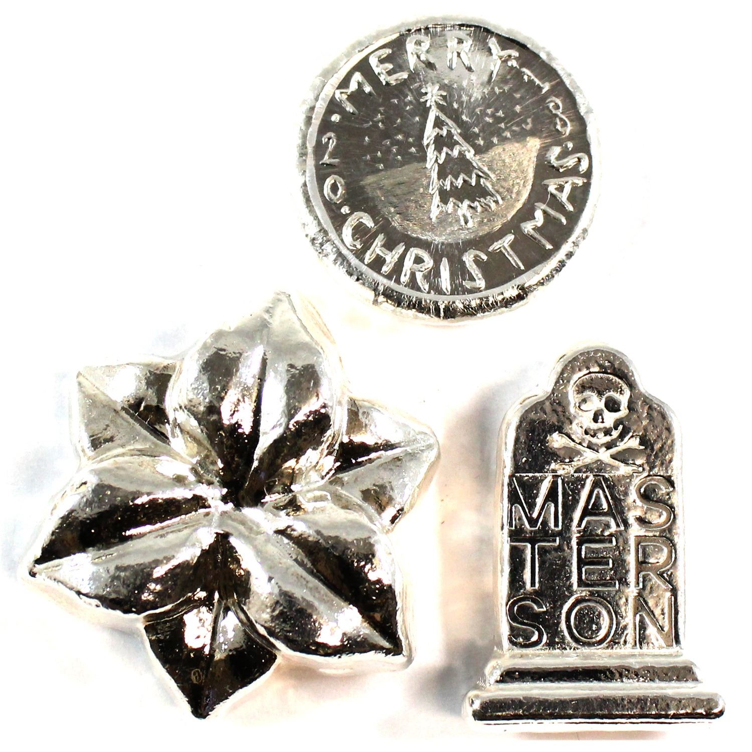Beaver Bullion/Pheli Mint Fine Silver Collection (Tax Exempt). You will receive the 3oz Pheli Mint Trillium, 1oz Beaver Bullion Christmas Round, and Masterson 1oz Tombstone. 3pcs.
