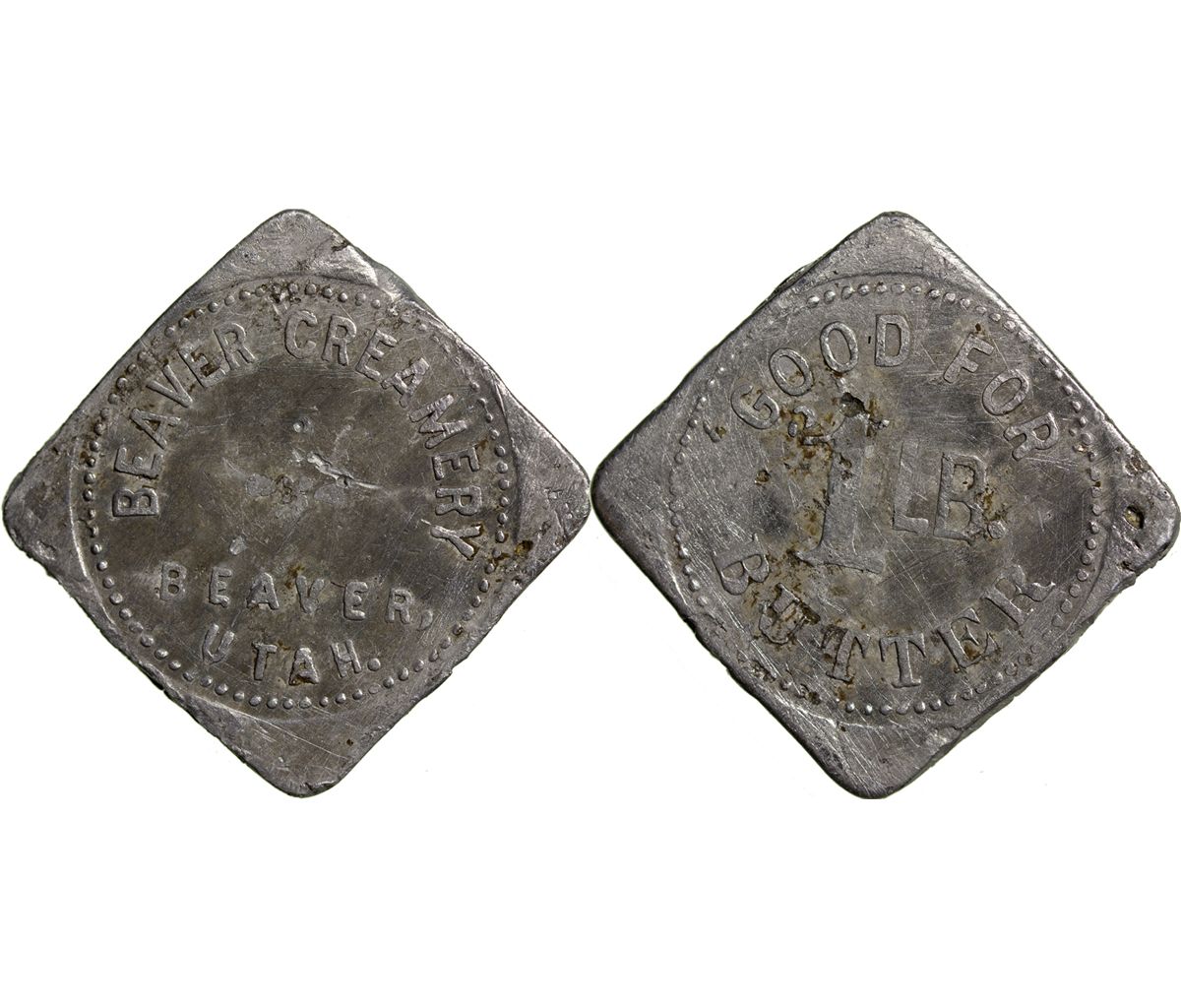 Obv.: "Beaver Creamery/ Beaver/ Utah." Rev.: "Good For/ 1 LB/ Butter". Square, aluminum, 24mm. Dug, G. -61396