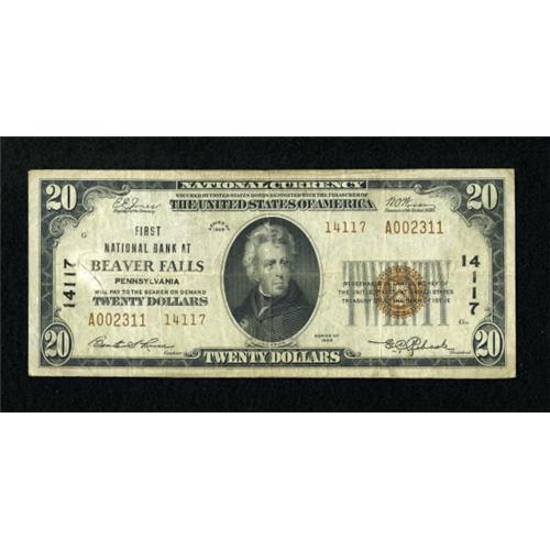 <B>Beaver Falls, PA</B></I> - $20 1929 Ty. 2 <B>First NB </B></I> Ch. # 14117<BR> This is a decent, well margined example from this popular 14000 charter that grades a nice <B>Fine-Very Fine</B></I> and is one of about twenty notes known on this high charter.<BR><BR><b>Shipping:</b> Coins & Currency (<a target="_blank" href="http://www.heritageauctions.com/common/shipping.php">view shipping information</a>)