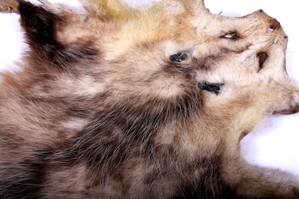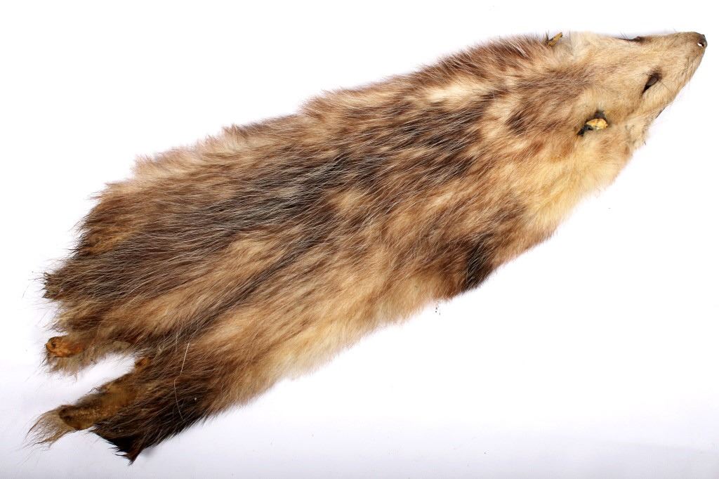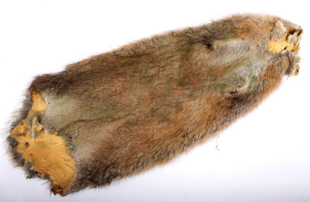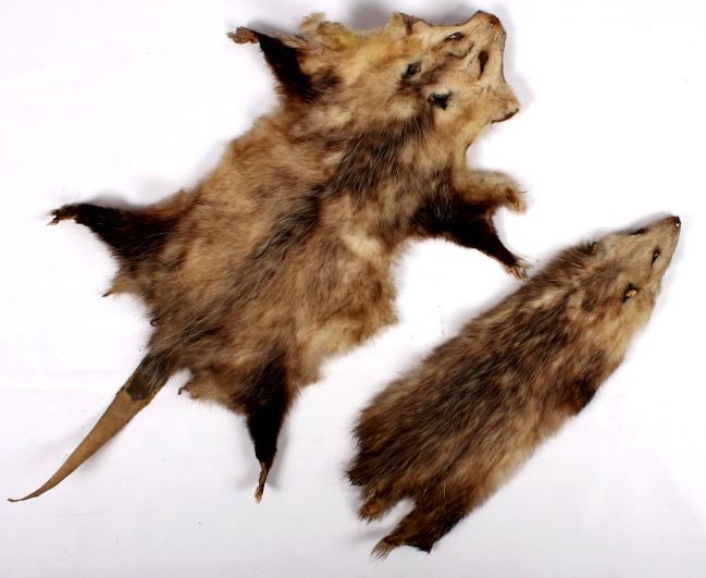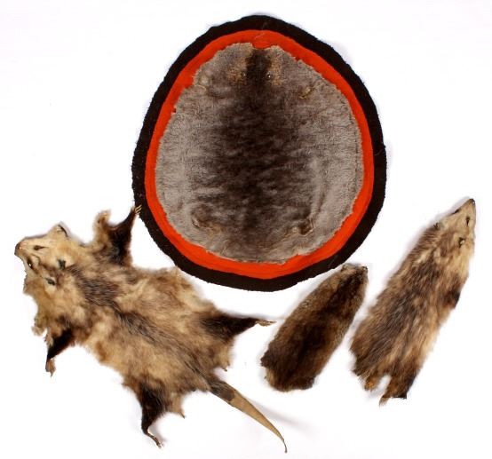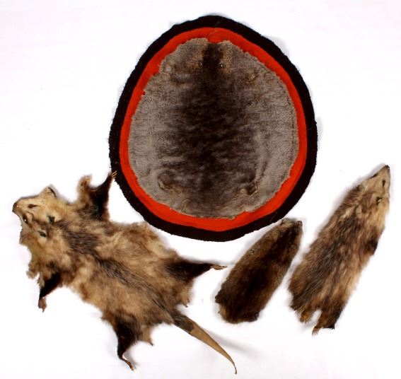 You are bidding on a professionally prepared, double felted beaver hide rug, two possum hides and one muskrat hide. The rug shows a wide border of orange on brown felt backing a grayish brown hide with matted fur. The rug is an oblong circle measuring about 29" in diameter. The two possum hides show beige to dark brown mottled fur typical of the species. One hide is stretched out and has claws and a tail ( measuring 37" x 21.5"), while the other is tubed and has no tail. The muskrat hide is also tubed and shows light to dark brown silky soft fur. The items are all in good condition.