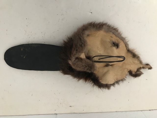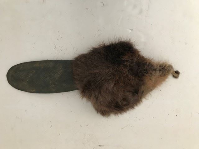 This North American life size beaver tail (static) was crafted by industry veterans Dave Nelson and Norman Tempia of AnimatedFX, Inc., and used in many commercials, including "Budweiser" and "Hertz". It is a realistic replica made from rubber and beaver fur. It features a detailed texture and coloration, with a slightly scuffed and faded paint.