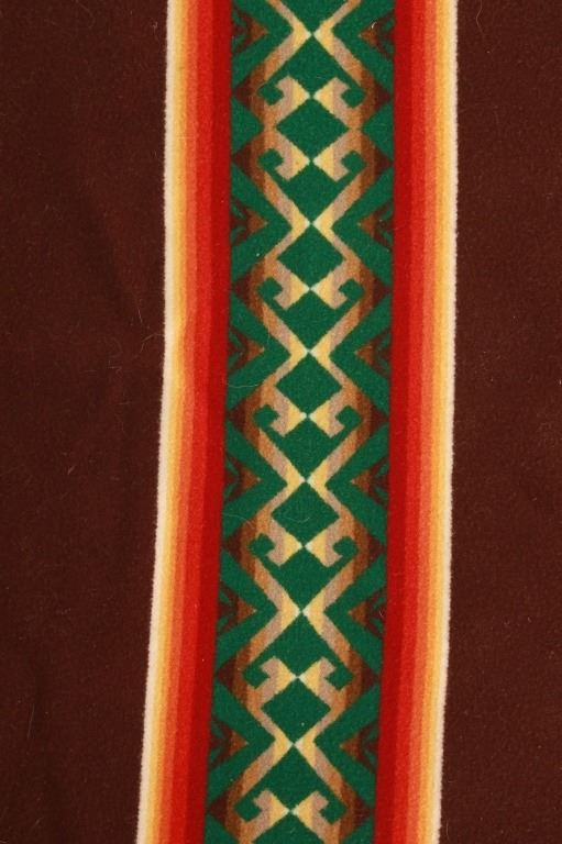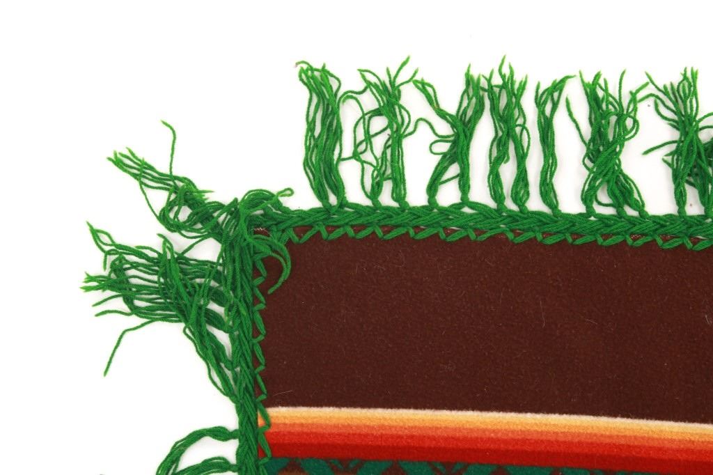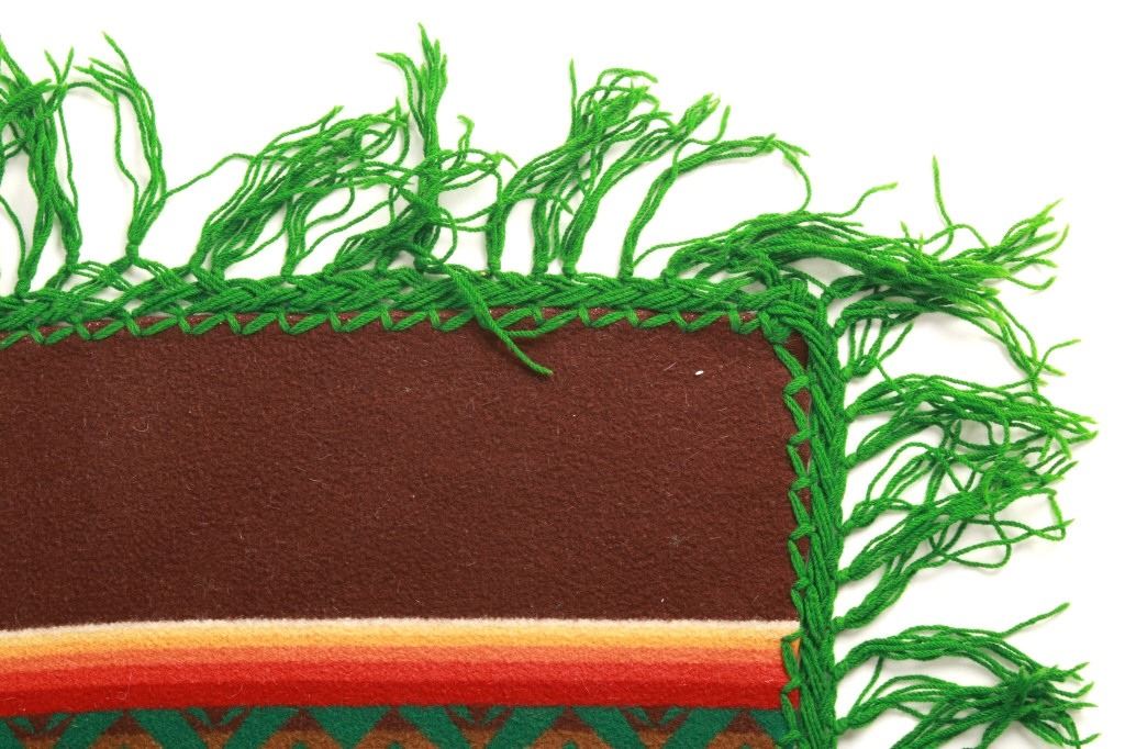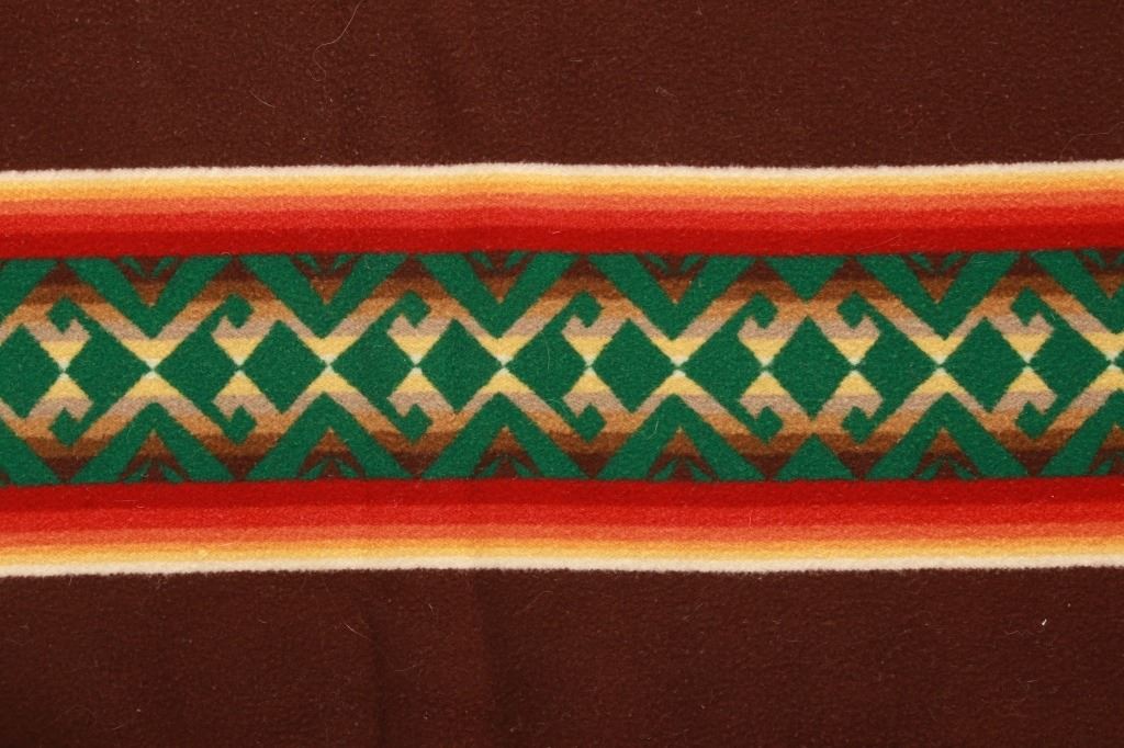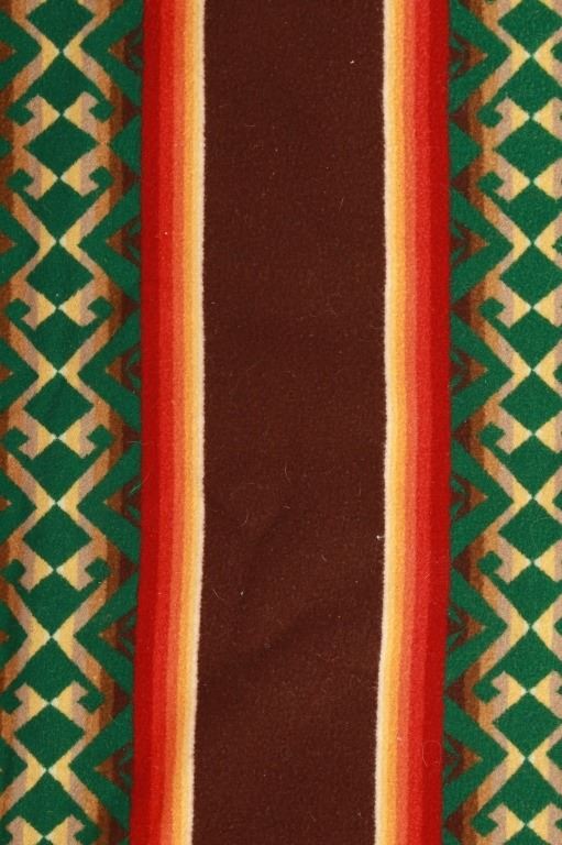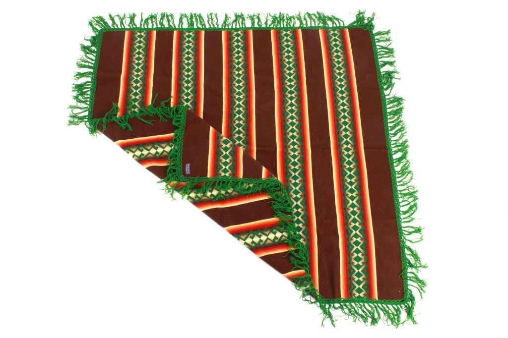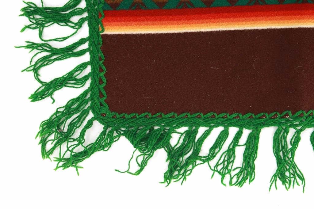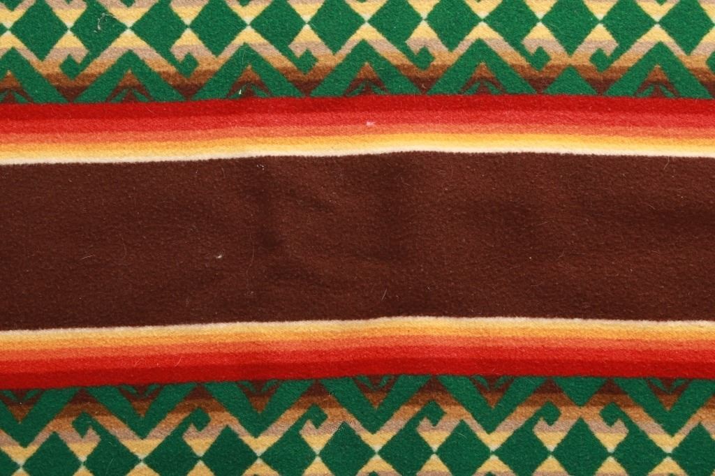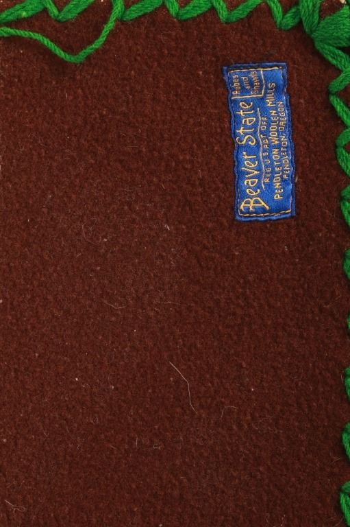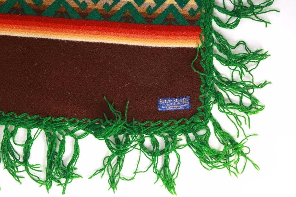 For your consideration is this beautiful Beaver State Pendleton Indian trade blanket with fringe. The banded blanket is primarily brown with bands containing an emerald-green serrated diamond pattern. The green pattern is on bands of cream, yellow, orange, red, dark red, brown, sage green, olive, and kaki. The blanket has green yarn tied fringe all the way around. The tag reads, "Beaver State/ Robes and Shawls/ Reg. U.S. Pat. Off./ Pendleton Woolen Mills/ Pendleton Oregon." The blanket is in excellent condition; it measures 64" x 62" with 5" fringe.