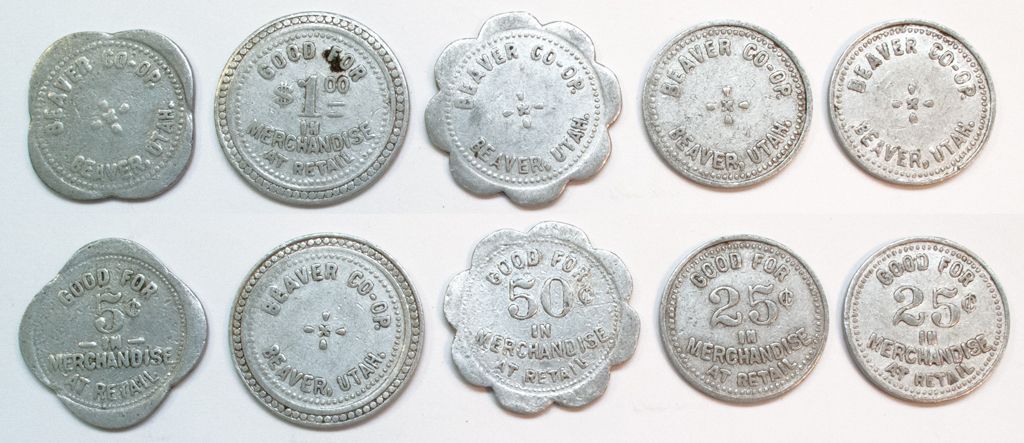 Lot of 5 R6 (Campbell's) Aluminum Beaver Co-op Tokens including: GF 5c IM at RTL; 25 c; 25 c; 50 c; $1.00