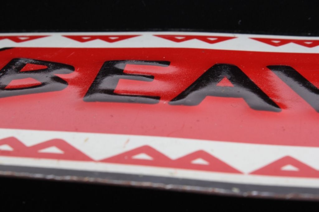 This is an original general store mercantile embossed lettering sign. The piece is for Beaver Vulcanite Roofing and reads "Test and Compare" on both the left and right of the sign. The piece shows a wonderful Native American type design and is made by Stout Sign Co. St. Louis. This sign shows great condition and is from circa 1900. Measures 4"x29.5"