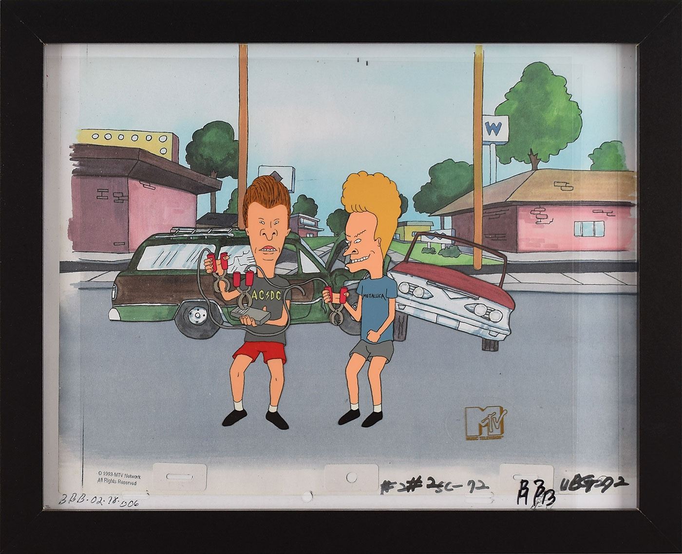 (MTV Networks, 1993) Original production cel from the animated television series Beavis and Butt-Head, which depicts the teenage metal-head buddies holding booster cables in front of two crashed vehicles. The cel is placed on a matching studio copy background. Total character image measures 4.75 x 6, and framed to an overall size of 15.75 x 12.75. The cel features an MTV label to lower right. In fine condition. Accompanied by a certificate of authenticity from MTV Networks.