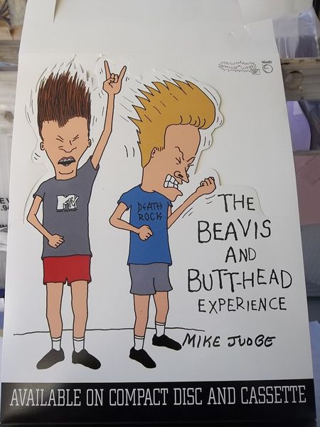Original store display for the Beavis and Butthead Experience on cassette and CD with artwork of the two characters signed in black ink by creator Mike Judge.