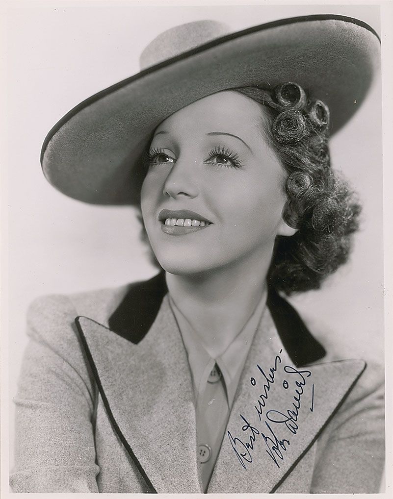 Vintage glossy 7.75 x 9.75 photo of Daniels in a pretty hat, signed in fountain pen, “Best wishes—Bebe Daniels.” In fine condition, with a lightly trimmed right edge.