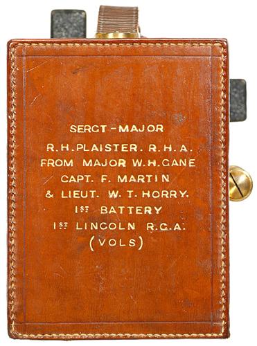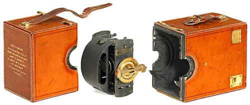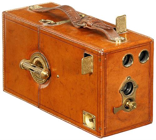 "Luxus-Frena No. 0", 1901 R. & J. Beck, London. Wunderschöne Magazinkamera mit ausgefallenem Dreh-Wechselmechanismus. Für Plattenformat 2 5/8 x 3 1/2 in. (ca. 6 x 9 cm). Objektiv: Beck-Steinheil Orthostigmat, Verschluß 1/10-1/40 Sek., Rückseite mit Widmung für einen Kapitän für Lebensrettung, verliehen von der Königin. - Keine zweite Kamera dieser Größe bekannt! Rarität!
