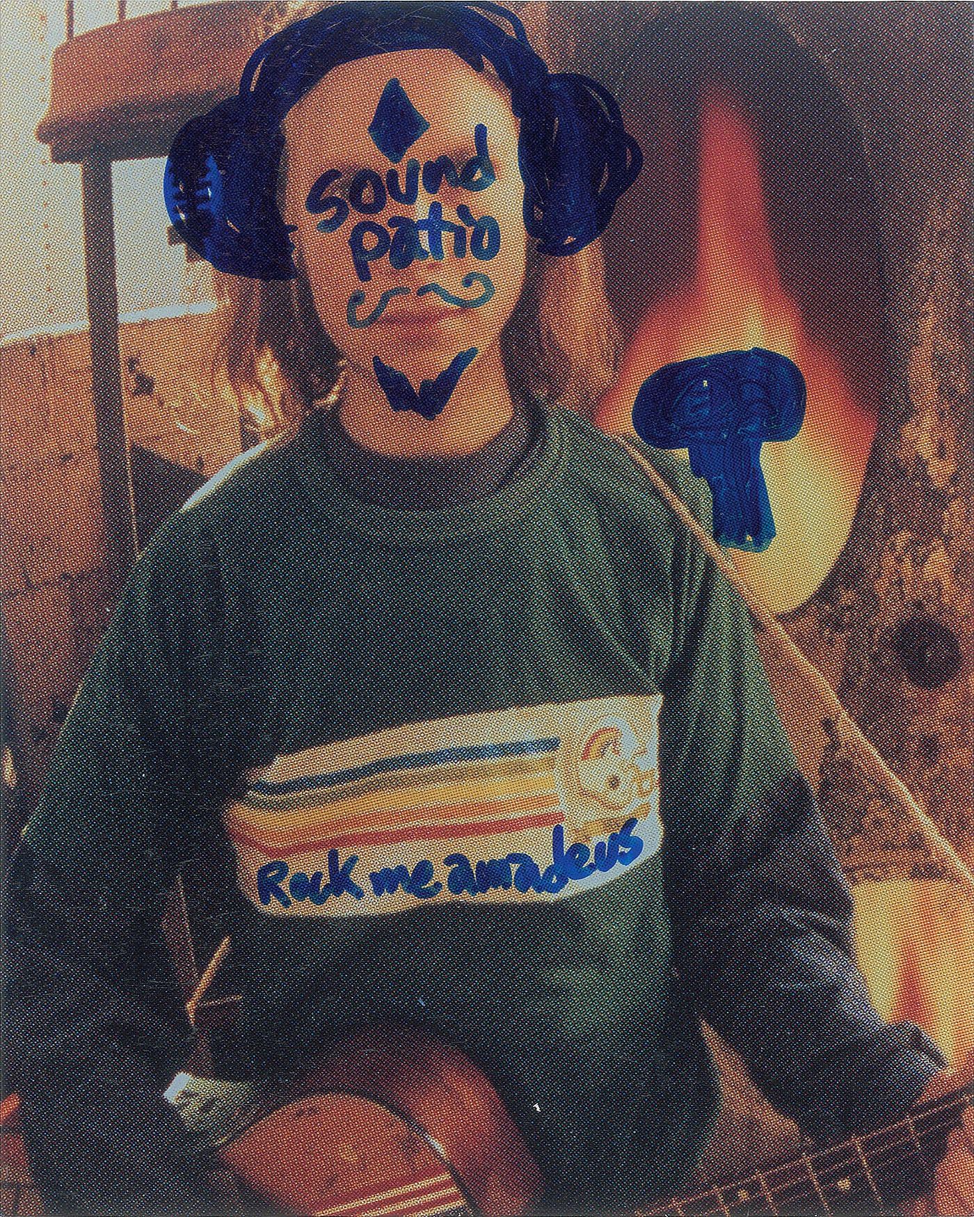 Unique color glossy 8 x 10 photo of Beck holding an acoustic guitar, signed on the reverse in blue felt tip, "b." On the front, Beck has written "sound patio" across his face and "Rock me amadeus" on his shirt, in addition to sketching a pair of headphones, a devilish mustache and goatee, and some other shapes. In fine condition.