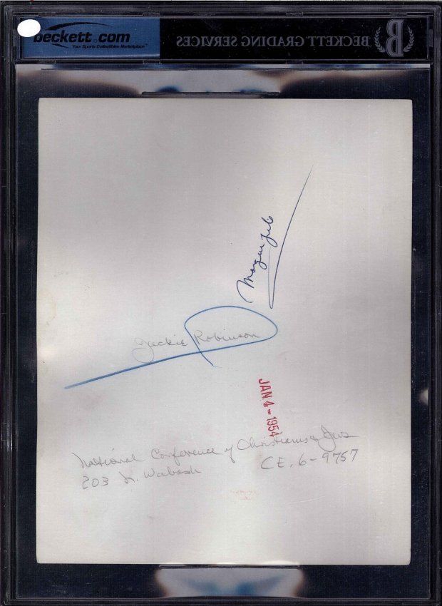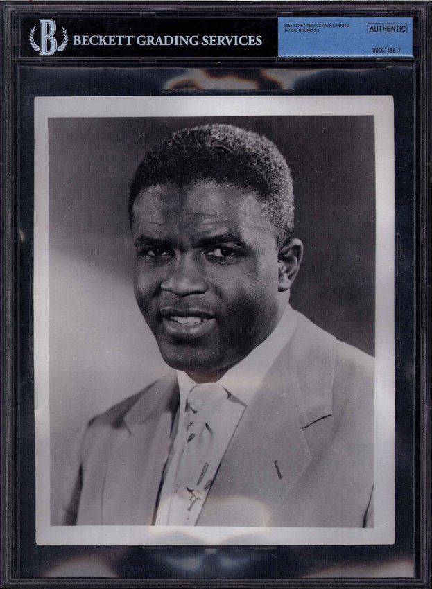 Beckett encapsulated type 1 photograph of Jackie Robinson in 1954 wearing a suit and tie. The writing on the back of the photograph states that it was taken at the National Conference of Christians and Jews. Photograph measures approximately 8 x 9 inches.