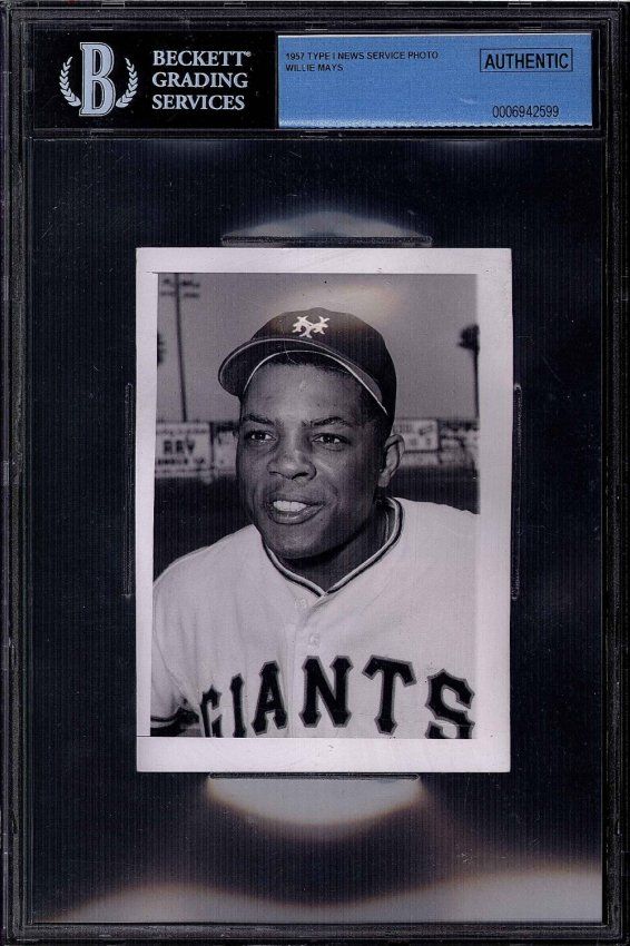 Beckett encapsulated photograph from 1957 of Willie Mays in his New York Giants uniform. This is an original type 1 photograph, which has the Seattle Times sticker on the reverse. Photograph measures approximately 4 x 5 inches.