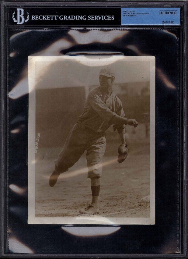 Beckett encapsulated photograph of Dick Hoblitzell in Red Sox uniform throwing a baseball. This photograph has all the stampings from the International News Service on the reverse. Photograph measures approximately 6 x 8.5 inches.