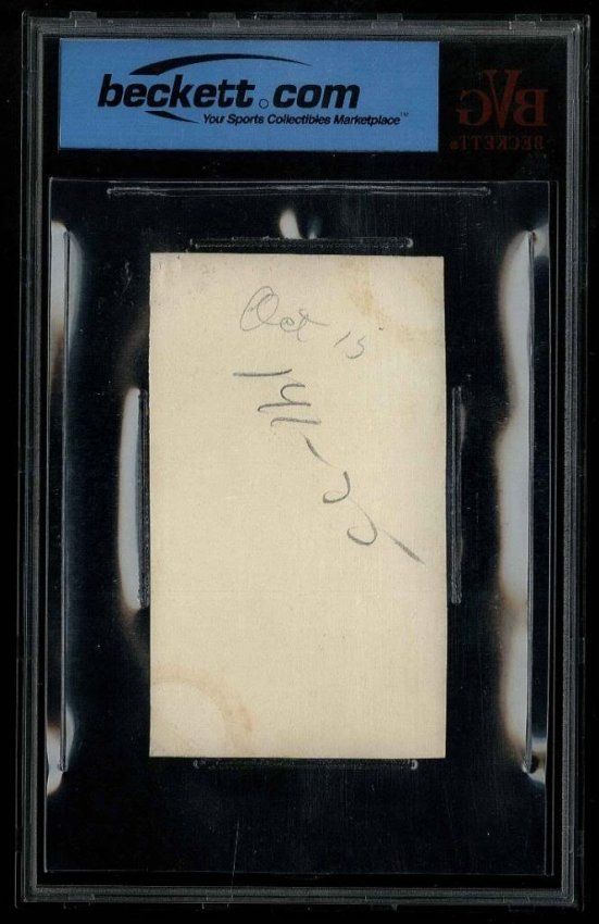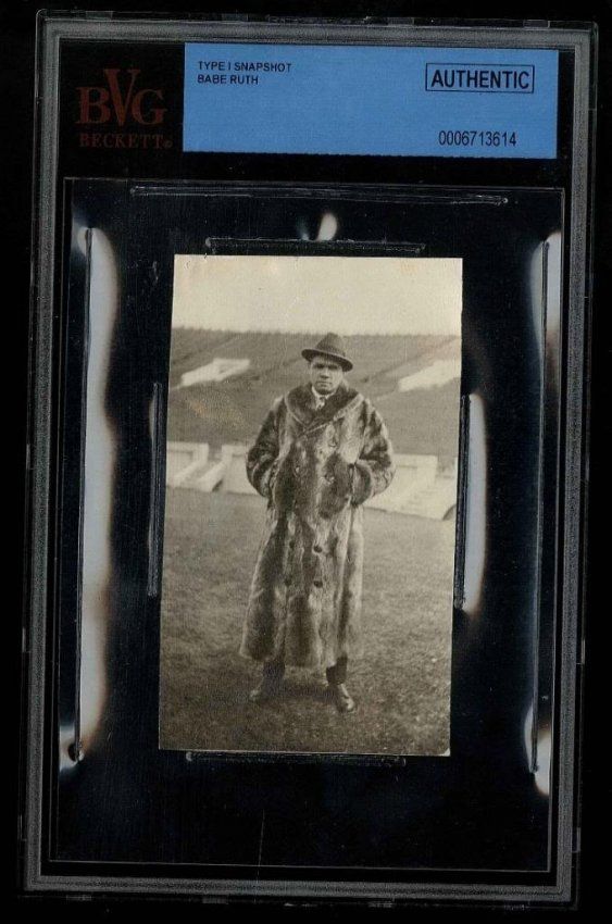 Beckett encapsulated babe Ruth type 1 snapshot. In this photograph Ruth is wearing his fur coat in an empty stadium. This picture may have been from the Babe's honeymoon. Photograph measures approximately 2.5 x 4 inches.