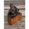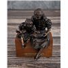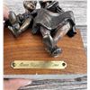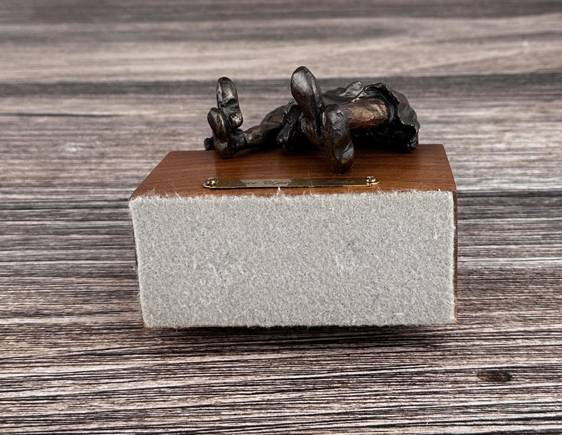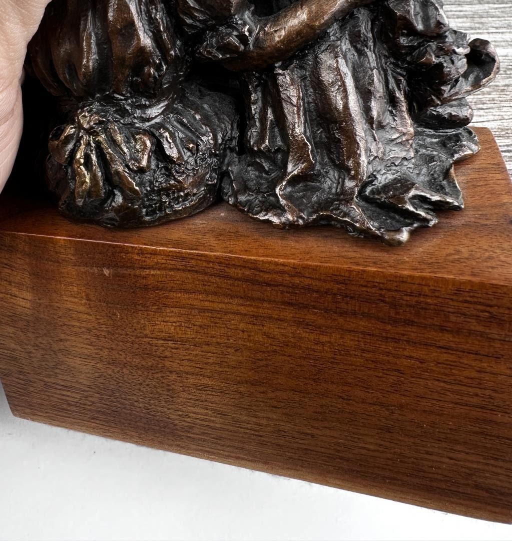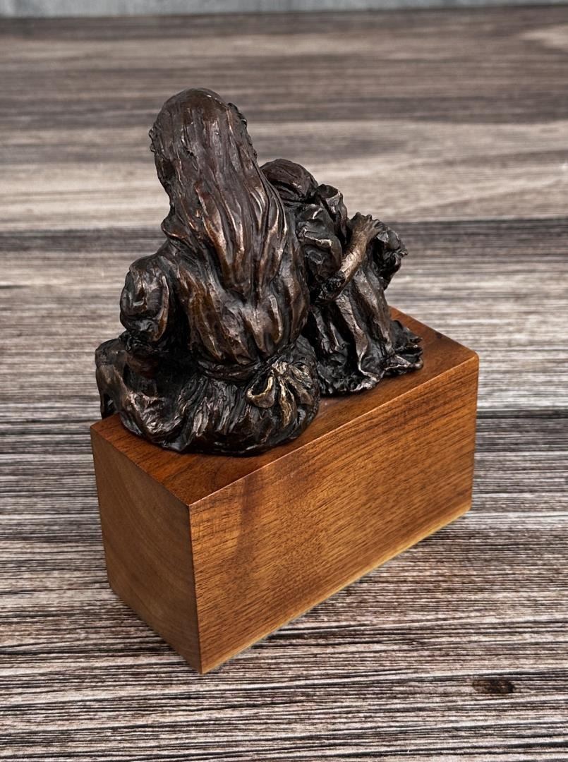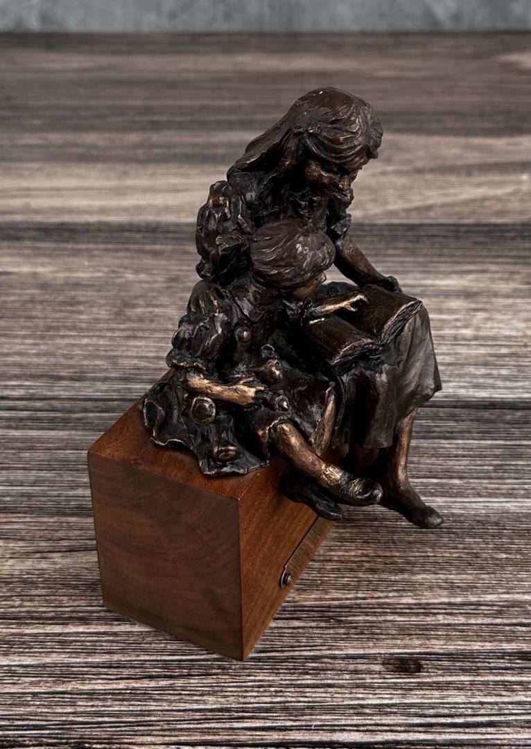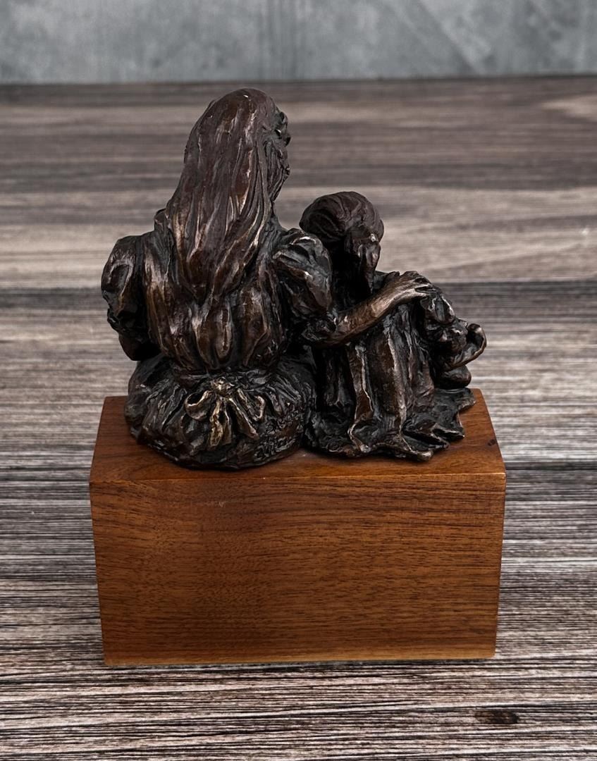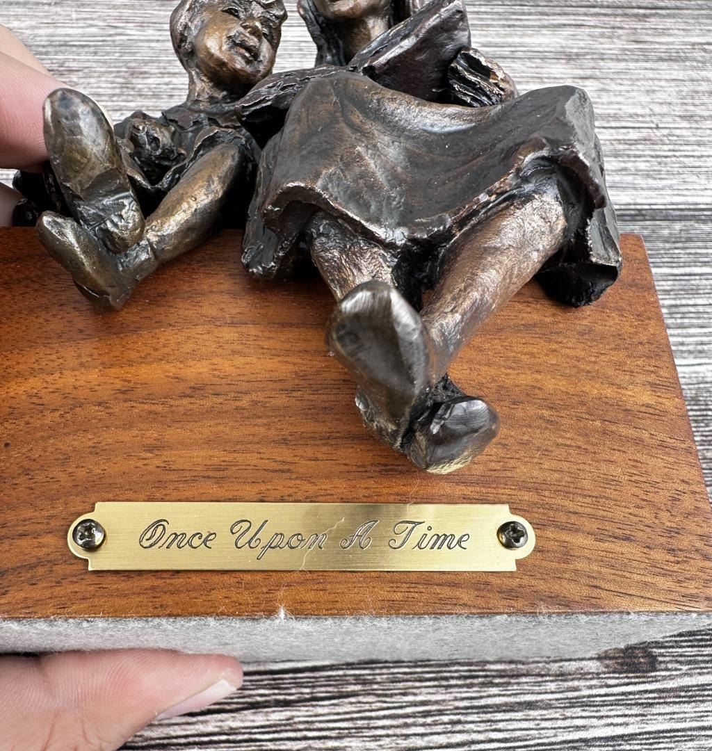6 1/4" by 4 1/2" by 3 1/2". Title is Once Upon a Time. Becky Eiker (Born 1942) was active/lived in Montana, North Dakota. Becky Eiker is known for Sculptor-figures of women and children. Born in 1942 in Valley City, North Dakota, Becky Eiker began her career as an art teacher, and then evolved into a potter and then made the natural transition into sculpture. Her interest in the human figure stems from a group of Helena, Montana artists who met and shared model expenses. Because the poses of models are limited and rather static, Becky began to draw from her imagination to get more action and feeling into her figures. Becky's sculpture has received numerous awards in juried competition. Because of her ability to work spontaneously in clay, she also participates in many "Qucik Draw" events. In 1999, Becky presented the City of Helena with her first life-size bronze of a newsboy entitled "Extra! Extra!" as a thank you for the community's support of her career. Becky and her husband reside in Helena, Montana.