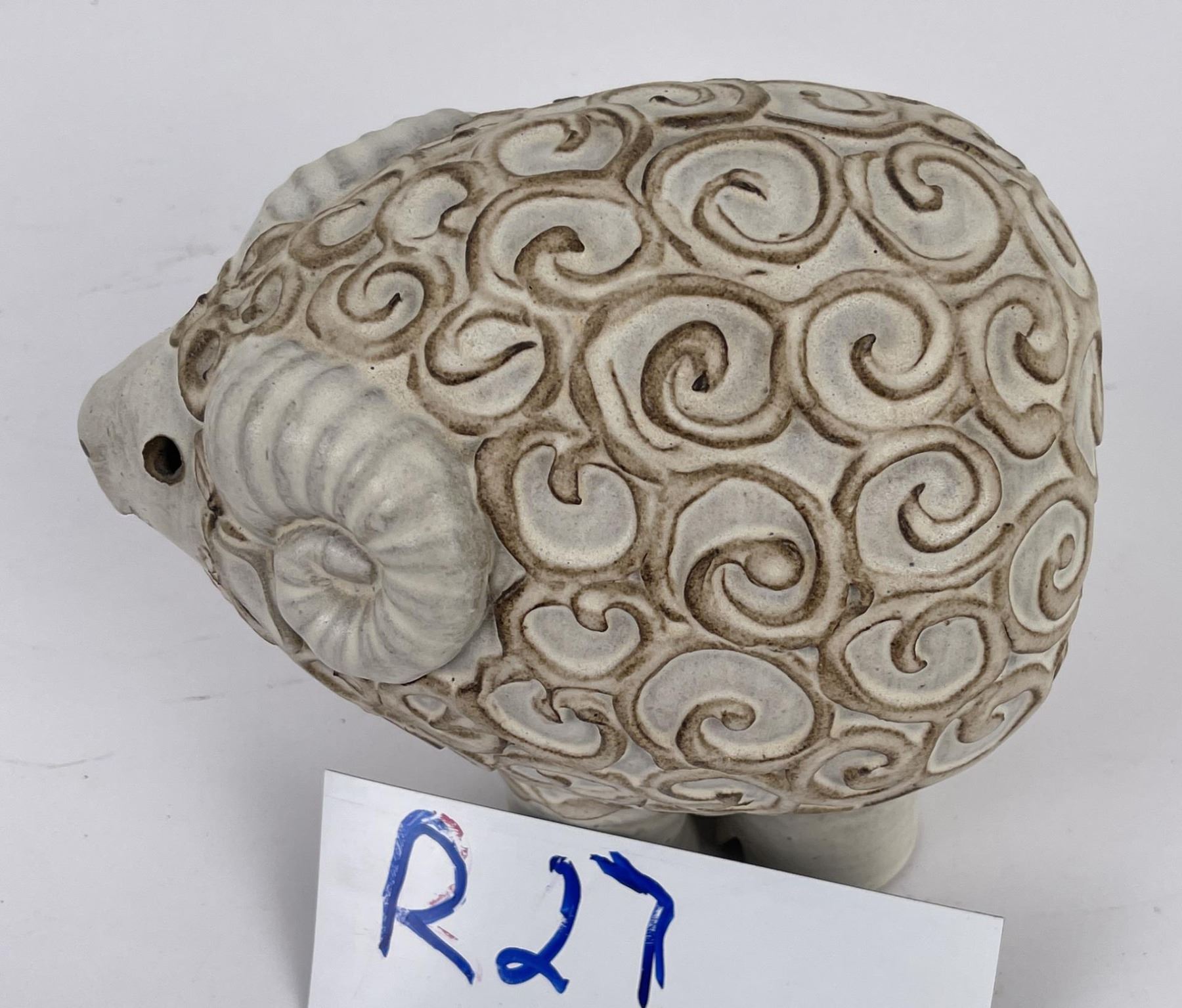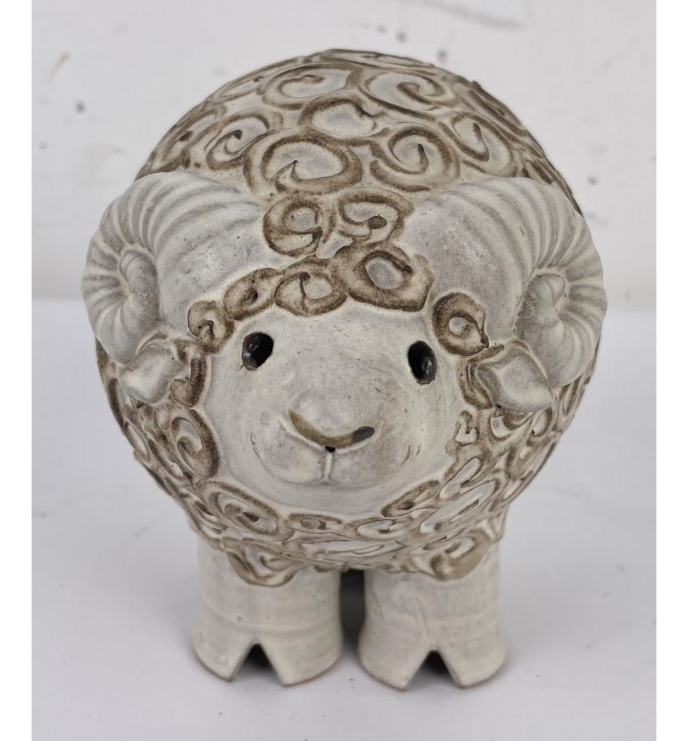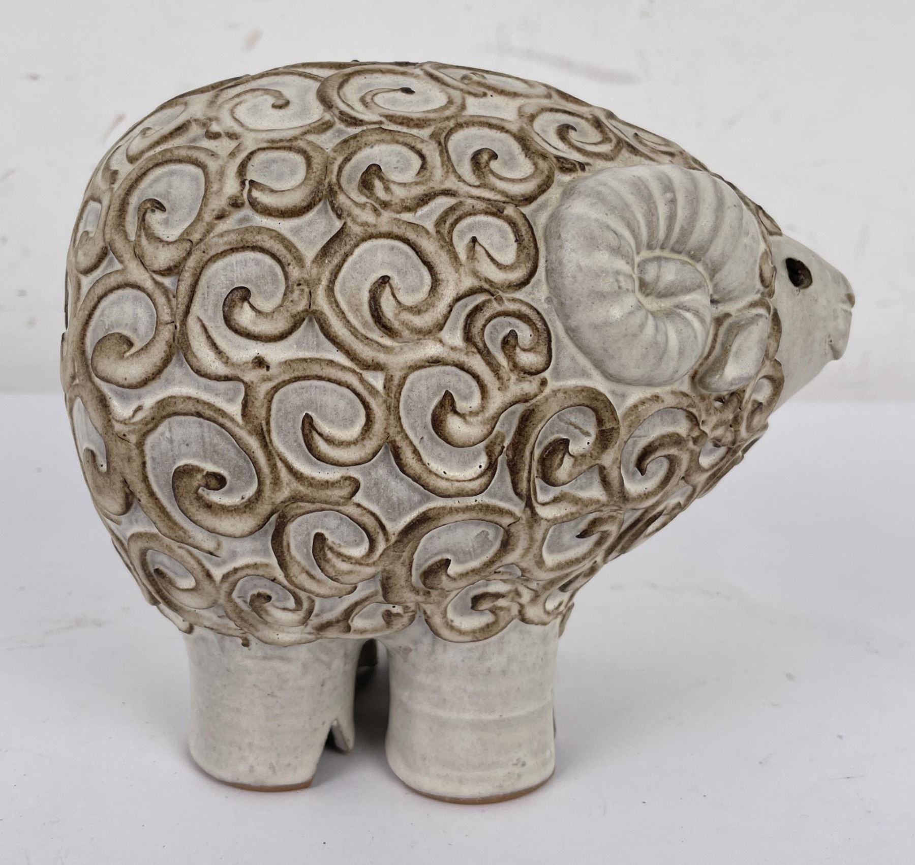 Ram 'ceranimal'. Made in Montana, signed. Approximately6 3/8" tall. The artist, Becky Eiker, began her career as an art teacher in Helena, MT and quickly evolved into an award winning potter/sculptor. Because of her ability to work spontaneously in clay, she also participates in many "Quick Draw" events. Her pottery is fired in oxidation in an electric kiln, which gives a distinctive quality to her stoneware. Animals have become one of Ms. Eiker's trademarks with over 25 whimsical "species" created.