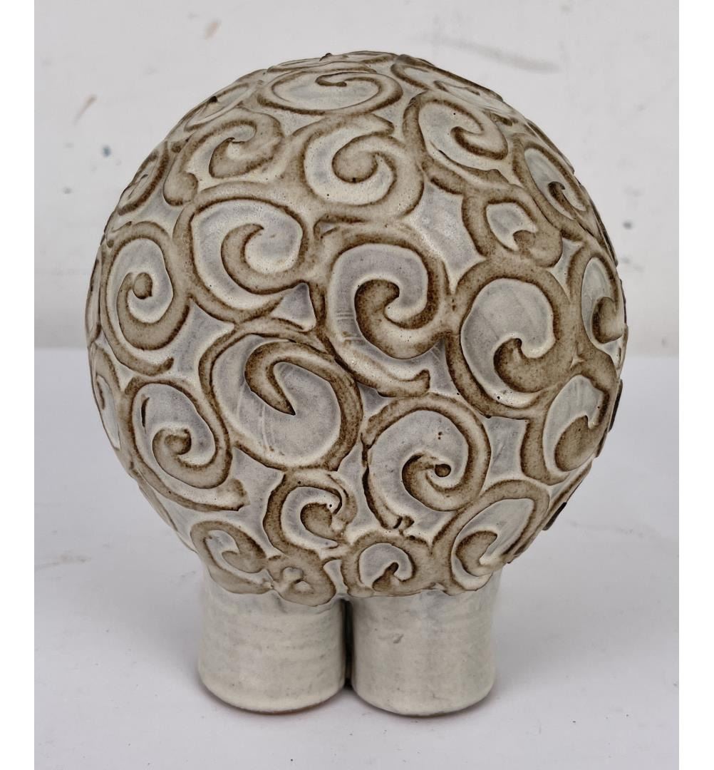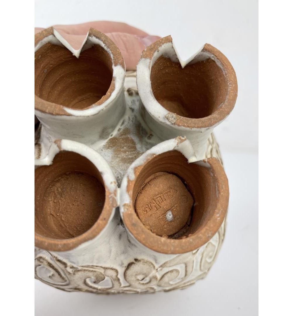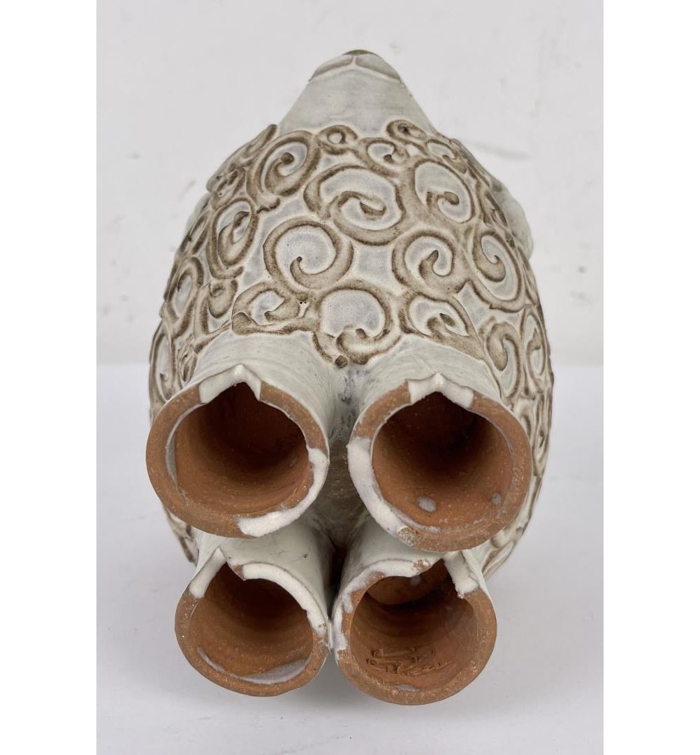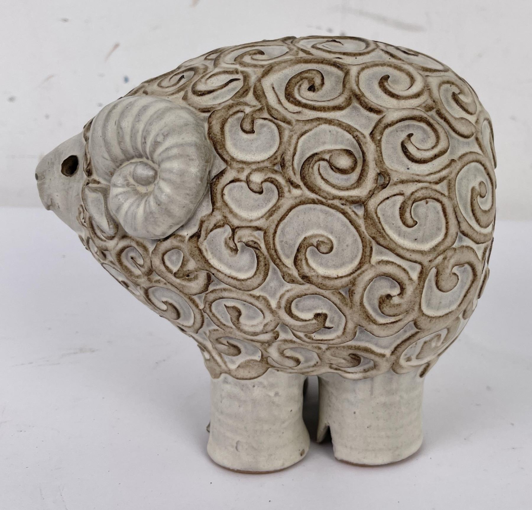Ram 'ceranimal'. Made in Montana, signed. Approximately6 3/8" tall. The artist, Becky Eiker, began her career as an art teacher in Helena, MT and quickly evolved into an award winning potter/sculptor. Because of her ability to work spontaneously in clay, she also participates in many "Quick Draw" events. Her pottery is fired in oxidation in an electric kiln, which gives a distinctive quality to her stoneware. Animals have become one of Ms. Eiker's trademarks with over 25 whimsical "species" created.