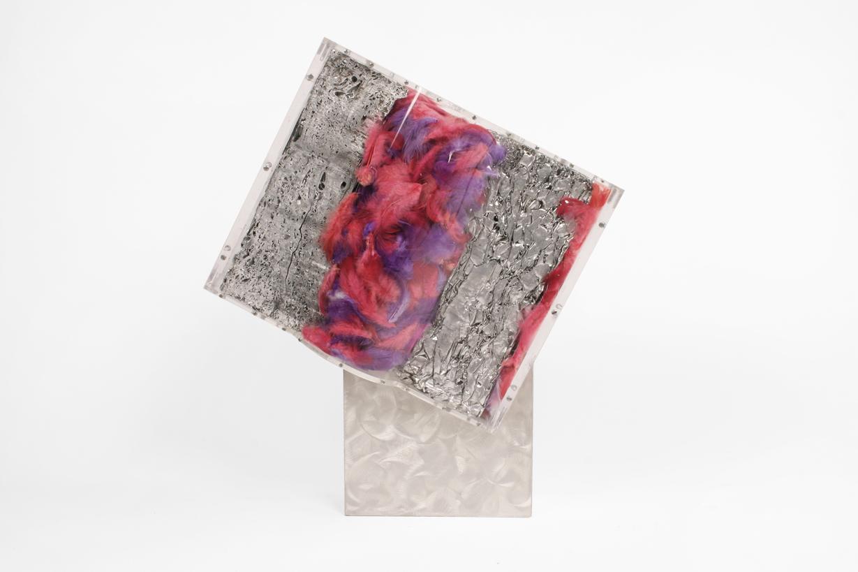 23h x 17w x 8d inches, aluminium, feather in plastic box. Bio: Becky Guttin: Universal Artist. The visual language of Guttin is related to the millennial Mexican tradition of sculpture that have generated archetypes of time, space, the finite, the infinite and the divine. The typical products of the Mexican traditions are transformed into the category of universal cultural constants, when they are sculpted or ordered like modules or packaged in modern industrial containers.