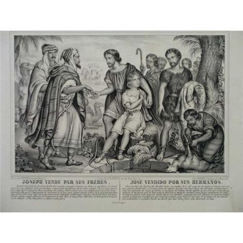 Biblical subject lithograph entitled "Joseph Sold by his Brothers." It is signed on the bottom center of the image Nap. Thom. (stands for Napoleon Thomas, a 19th Century French artist). The text below the image describes the scene in French and Spanish, the lithograph was done by Becquet. One of a series of three listed separately. Undated but I have seen similar lithographs by Becquet dated mid 19th Century by the Direction des Musées de France. In very good used condition with minor signs of wear as shown. Please ask questions, request additional photos and shipping costs before buying.