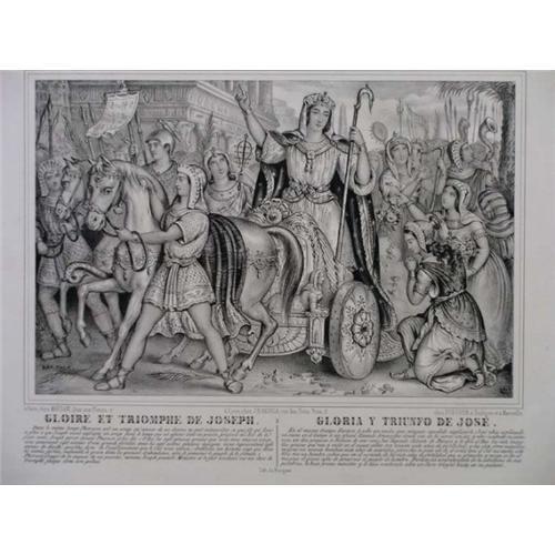 Biblical subject lithograph entitled "Joseph's Glory and Triumph." It is signed on the lower left of the image Nap. Thom. (stands for Napoleon Thomas, a 19th Century French artist). The text below the image describes the scene in French and Spanish, the lithograph was done by Becquet. One of a series of three listed separately. Undated but I have seen similar lithographs by Becquet dated mid 19th Century by the Direction des Musées de France. In very good used condition with minor signs of wear as shown. Please ask questions, request additional photos and shipping costs before buying.
