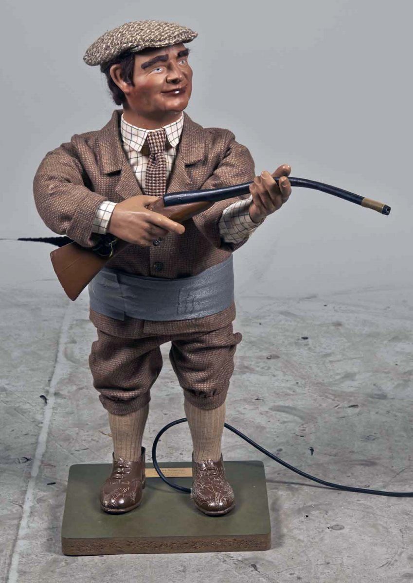 Hand crafted in England Serial No. 312. Rubber shotgun and shoes with some cracking to paint, tweed outfit. Condition (Very Good). Size 32" T.