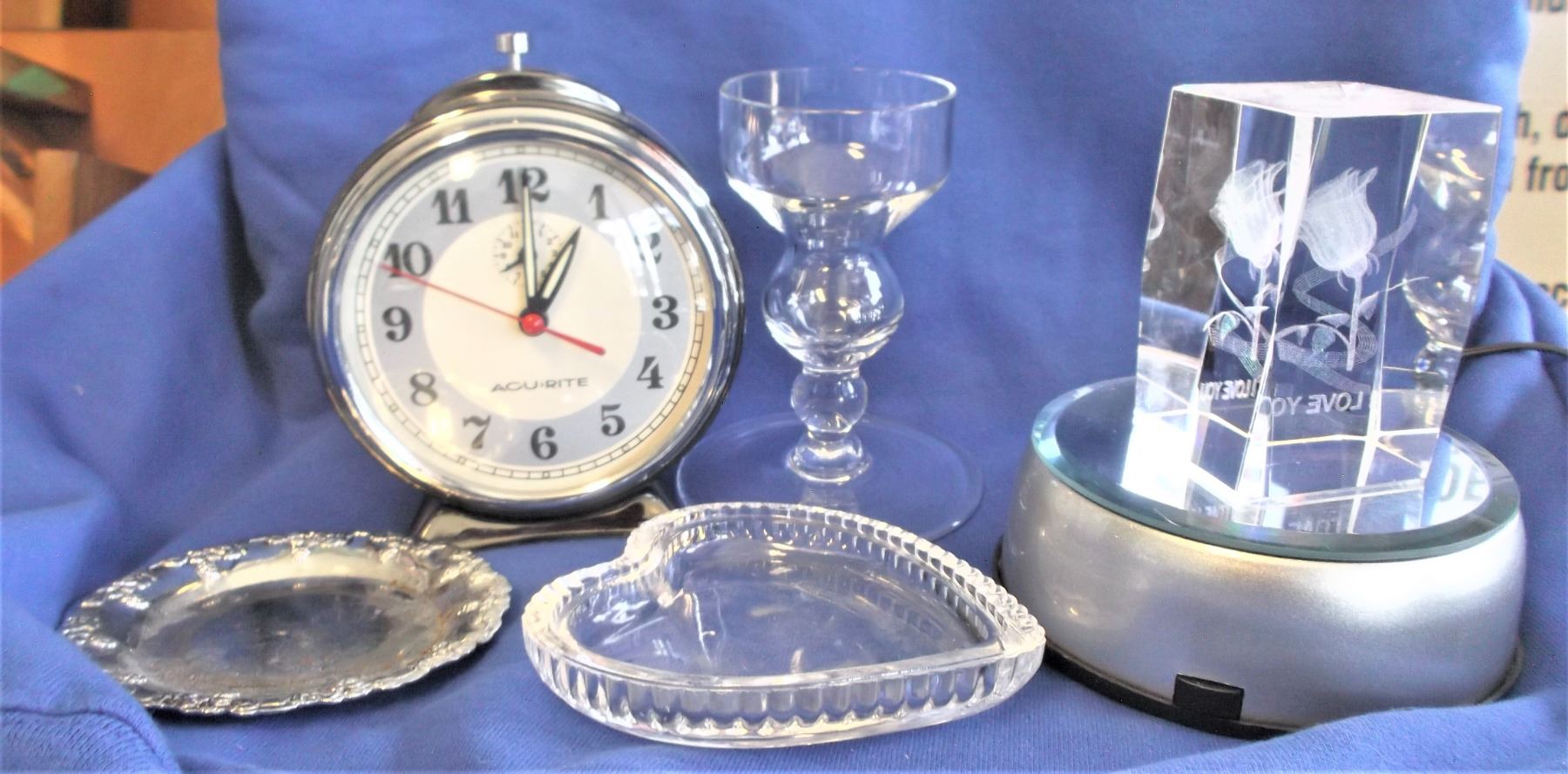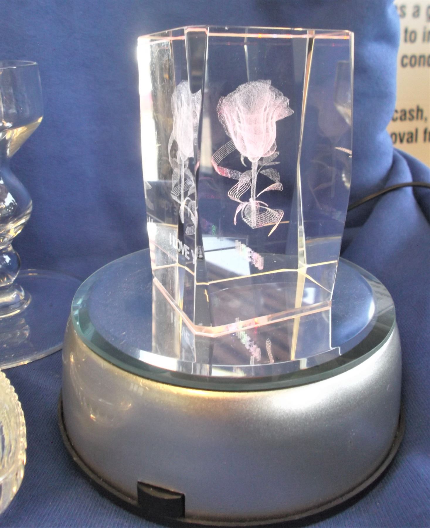 NOTE: The silver base for the glass ornament works, it lights up with a colour changed LED, slowly rotates the item, and when pressed plays "Jingle Bells"