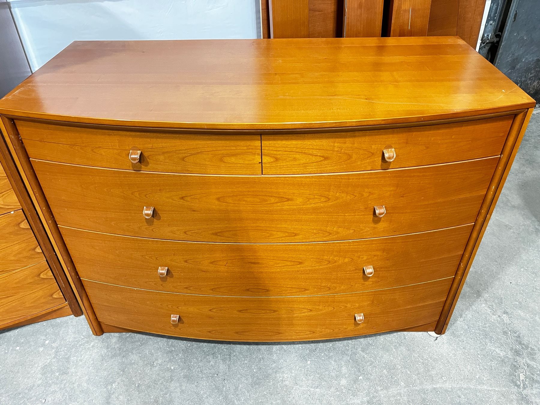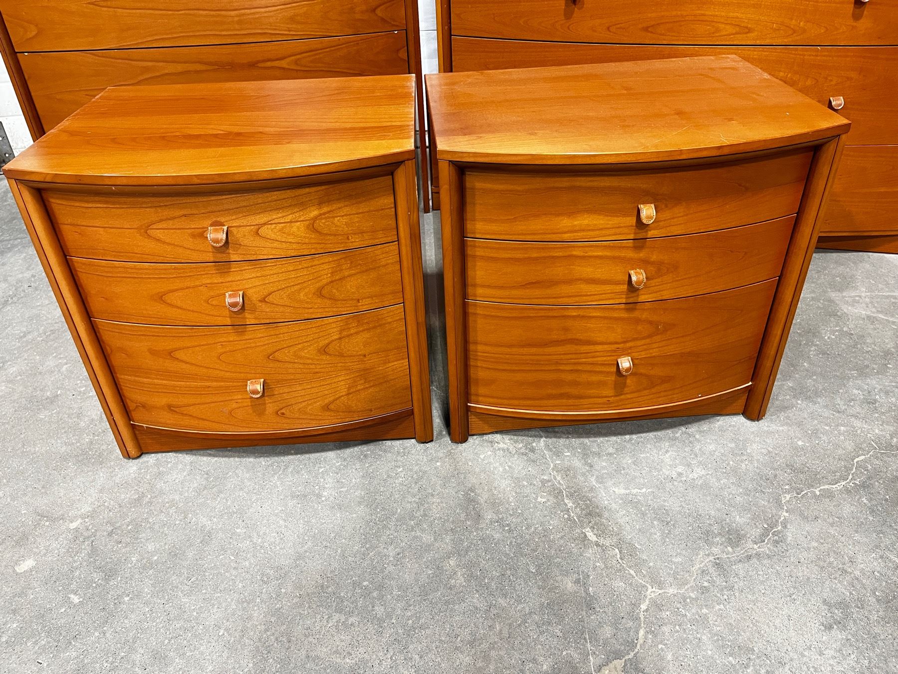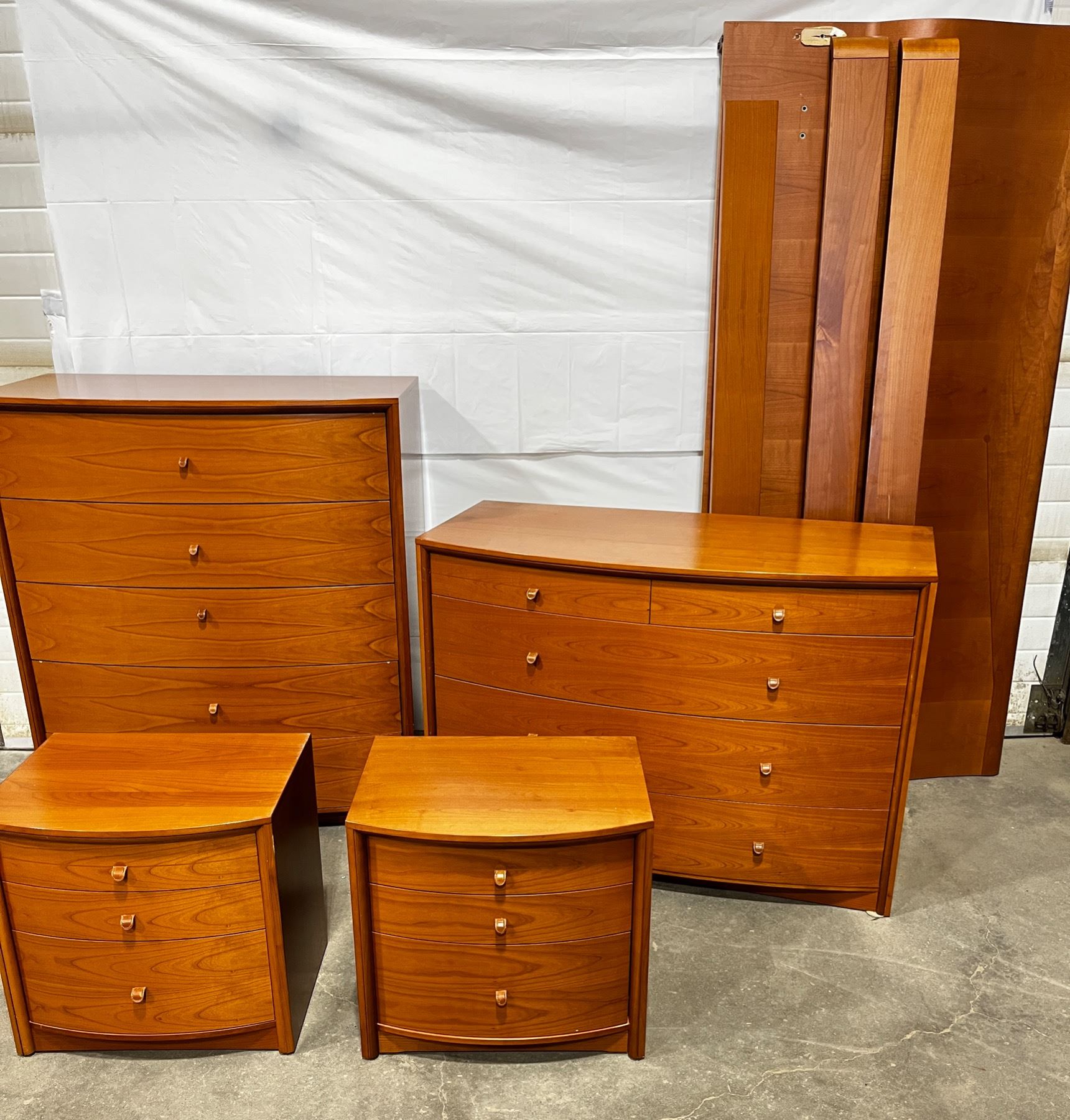 Fattori - made in Italy. 8pcs,includes. King Bed Frame,2x nightstands,22"H x 23"L x 18"W. Med.Dresser 35"H x 49"L x 24"W. Large Dresser 4'H x 42"L x 23"W Some minor scratches.