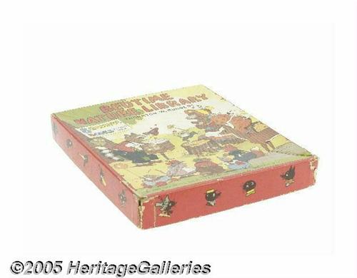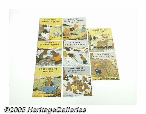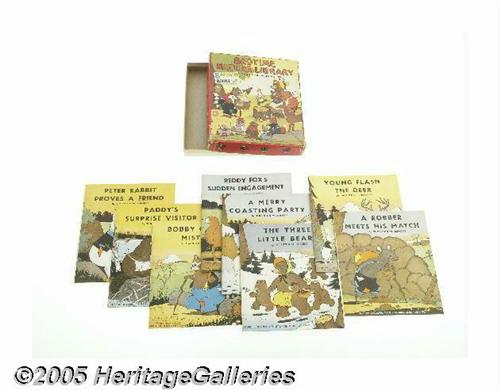 <B>Bedtime Nature Library (The Platt & Munk Co., 1940).</B></I> As popular as the writings of Thornton Burgess were during the early part of the last century, many collectors remember most fondly the Peter Rabbit collaborations between Burgess and Harrison Cady. Cady, whose children's illustrations remain his best known work, was a great talent, whose work also appeared in such diverse humor magazines as <B>Judge</B></I> and <B>Life</B></I>. The boxed set presented here includes the softcovered volumes of: <B>Bobby Coon's Mistake</B></I>, <B>Reddy Fox's Sudden Engagement</B></I>, <B>A Merry Coasting Party</B></I>, <B>The Three Little Bears</B></I>, <B>Young Flash the Deer</B></I>, <B>A Robber Meets His Match</B></I>, <B>Paddy's Surprise Visitor</B></I>, <B>Peter Rabbit Proves A Friend</B></I>. Each of the eight volumes in this 1940 Platt and Munk set appear to be unread, and each feature a combination of both color and black and white Cady illustrations. With no fading, it's a sharp box, with a single corner separation and some nicking/chipping at corners. <I>From the Larry Jacobs Collection.</B></I>