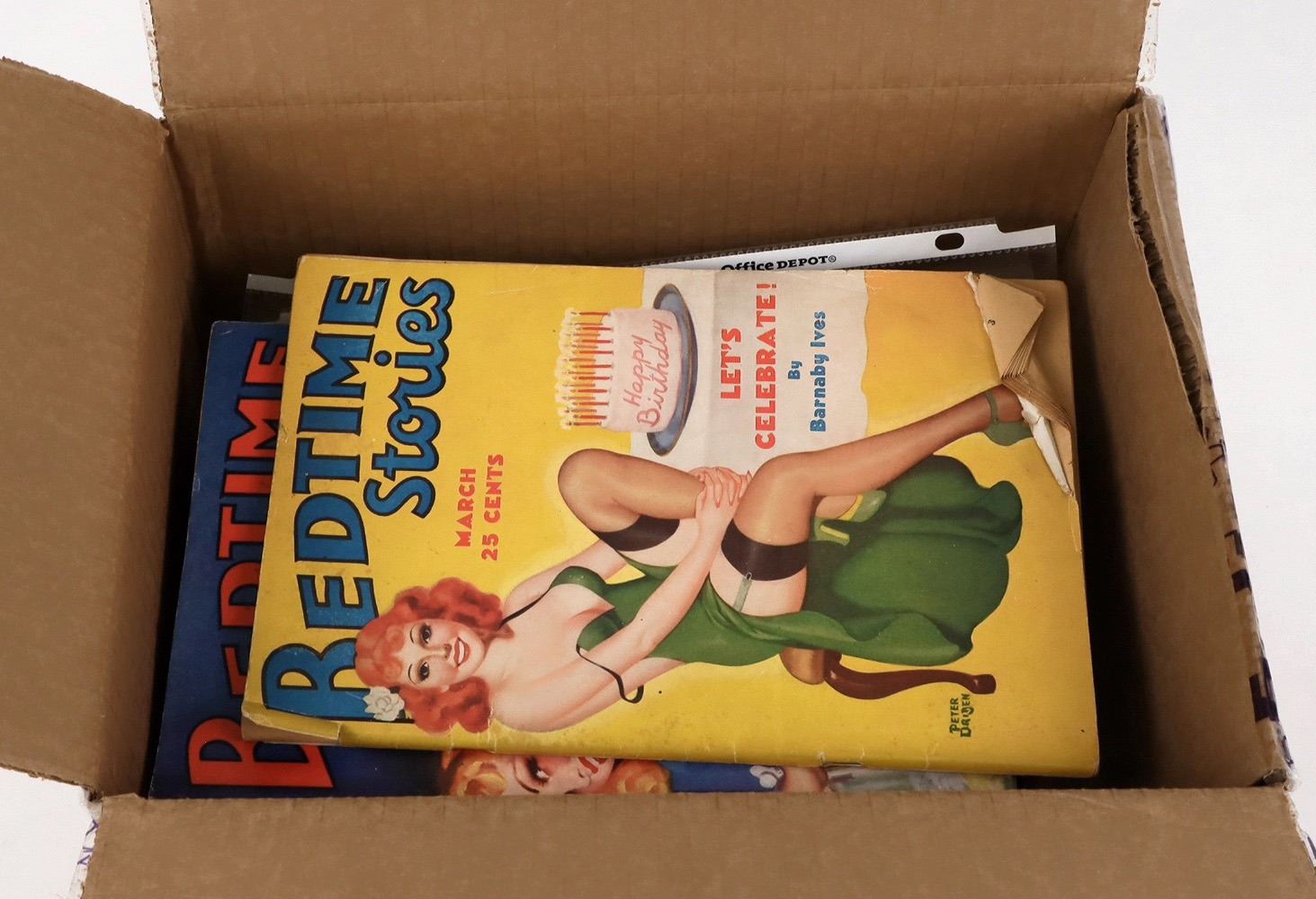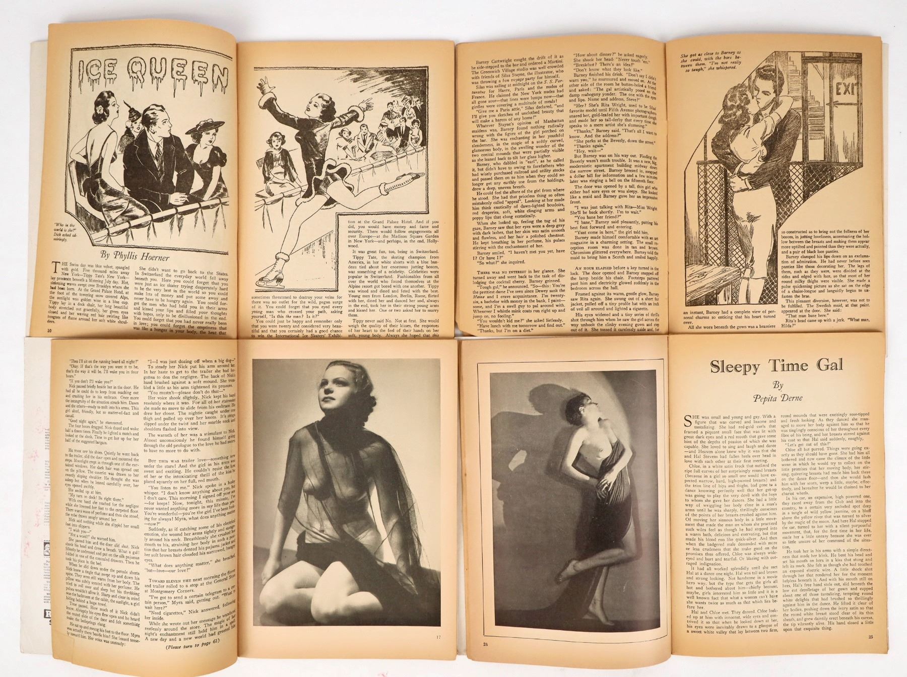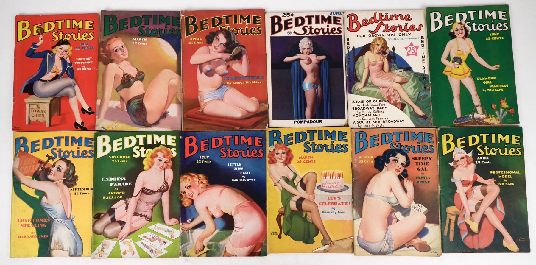 Twenty one issues of Bedtime Stories magazine, published by D. M. Publishing Co., Dover, Delaware. Dating from 1932 to 1937. Short stories and nude photographs long before Hugh Hefner came along. Each issue 7 x 10 inches and about 60 pages, excellent condition, each in plastic protectors.