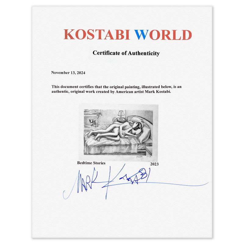 "Bedtime Stories" is an original drawing on paper by Mark Kostabi, hand signed by the artist. This piece comes custom framed. Includes Certificate of Authenticity. Measures approx. 15" x 18" (frame), 9" x 12" (image). This item requires special handling and may have a longer than usual turnaround.