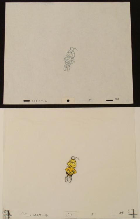 Buzz is full. This original animation cel & drawing are from the production of the Cheerios cereal commercial. Original Animation Cel & DrawingMedium: Hand painted acetate celDetails: Animation notations and peg holes Original "rough" a