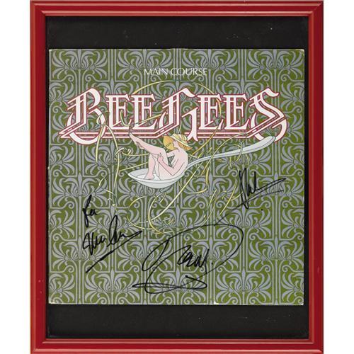 <B>Bee Gees "Main Course" Signed Album Cover.</B></I> One of the most popular acts of the '70s, the Bee Gees helped define the Disco era -- and were often pilloried for it in later years. Nevertheless, Rock's most successful brother act has secured a place in music history as one of the most memorable groups of all time. This copy of their 1975 release "Main Course," a breakthrough album that marked the group's first foray into Disco, is signed by the Brothers Gibb -- Barry, Robin, and the late Maurice. It is in great condition with some minor wear around the edges, and has been framed to an overall size of 14" x 17.5". <I>With COA from PSA/DNA.</B></I>