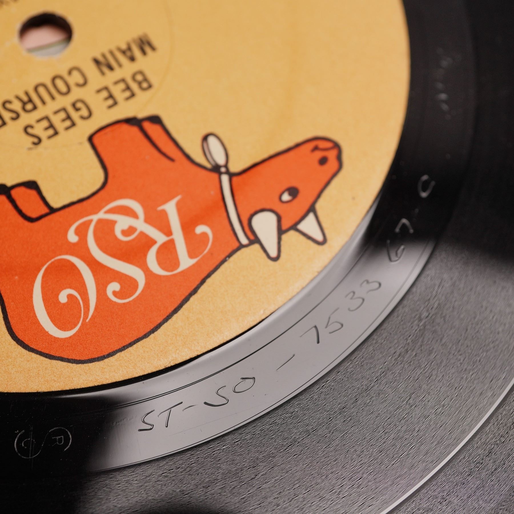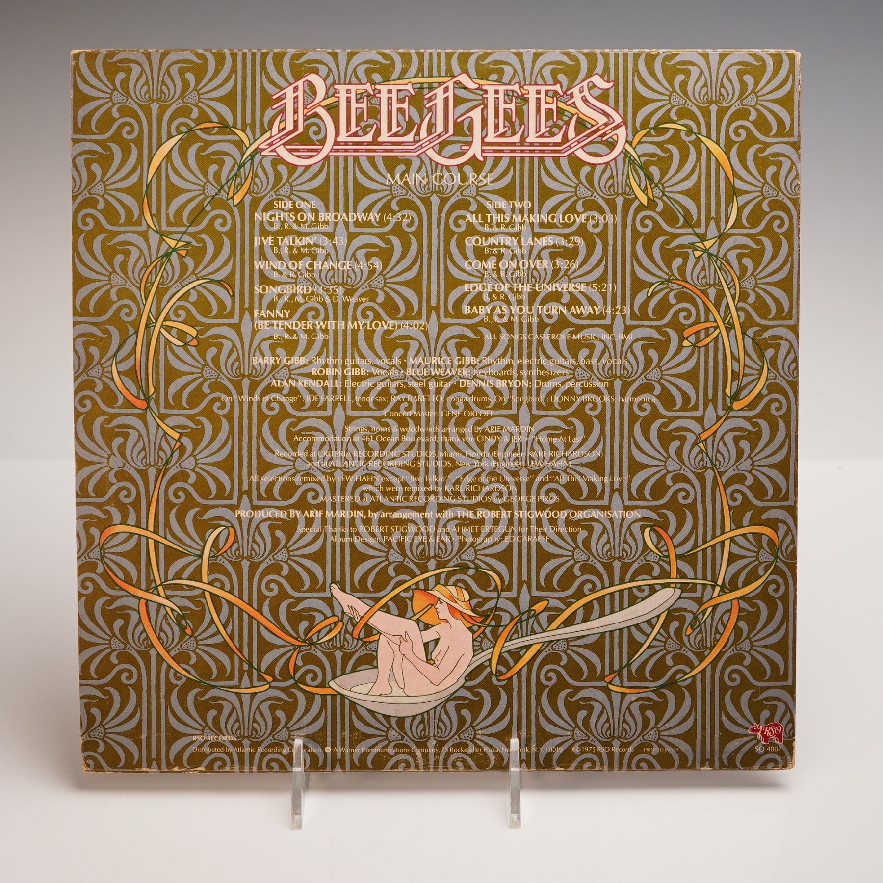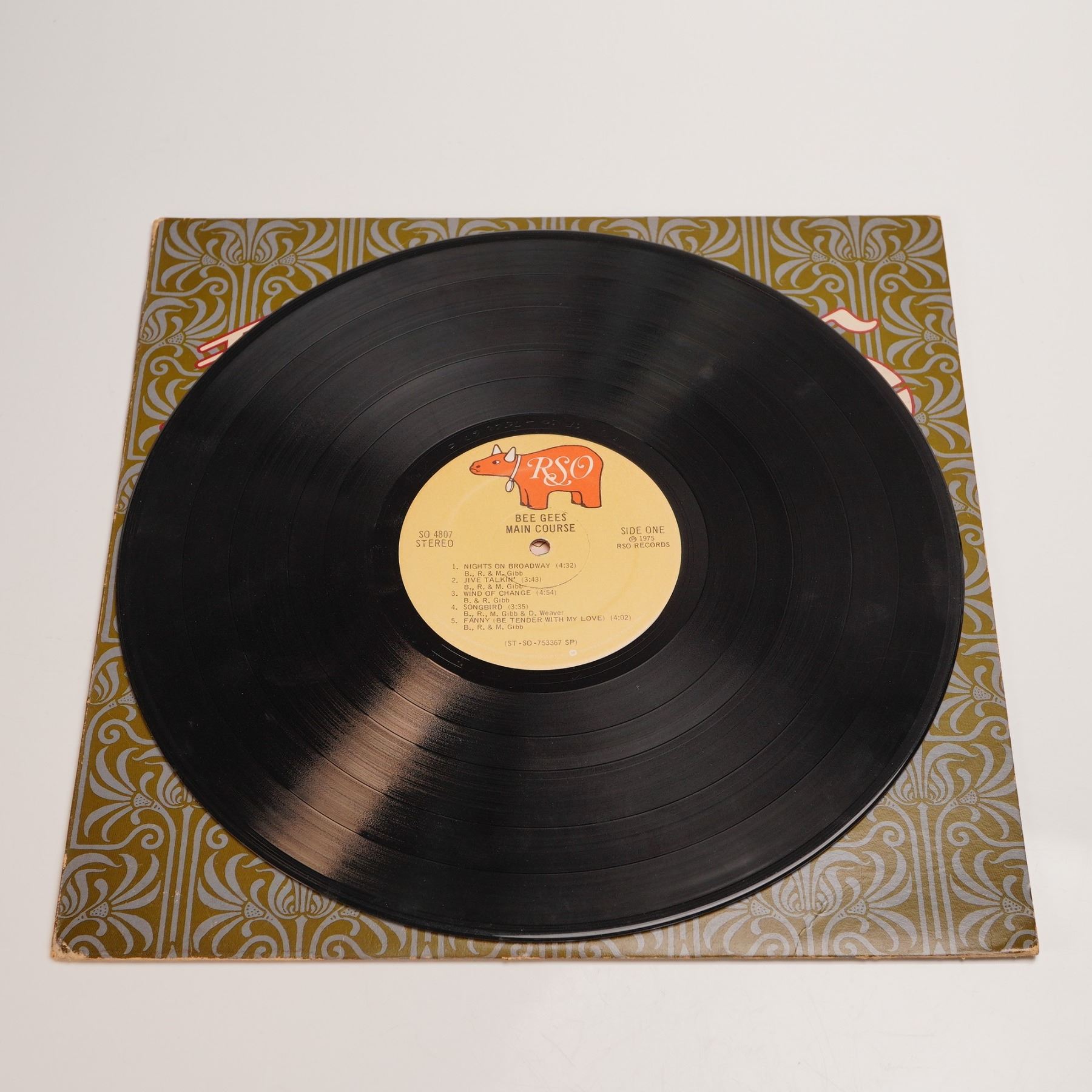 Original 1975 pressing of the Bee Gees Main Course album released by RSO Records, catalog number SO 4807. Matrix number ST-SO-7533-67 etched in the runout. Features key tracks from the group's transition into disco, including "Nights on Broadway," "Fanny (Be Tender with My Love)," and "Jive Talkin'." Includes the original stylized art nouveau gatefold jacket. The vinyl record has a standard 12" dia. and comes in its original album jacket. Jacket measures approx. 12.5"W x 12.5"H.