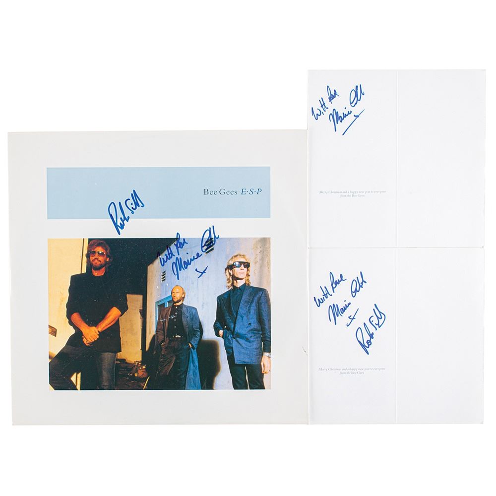 Two items: a Christmas card insert for the Bee Gees single ‰Û÷E.S.P.,‰Ûª and a 12-inch single album for ‰Û÷E.S.P. / Overnight,‰Ûª both signed in blue felt tip, ‰ÛÏWith love, Maurice Gibb, x‰Û and ‰ÛÏRobin Gibb.‰Û Also includes another Christmas card insert, which is only signed by Maurice. In overall fine condition. The 12-inch single record is included.