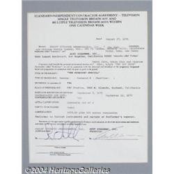 <B>Bee Gees Signed, Matted Ensemble.</B></I> This stunning display piece contains a treasure for fans of the Bee Gees. It's the group's two-page contract to appear on "The Midnight Special," taped on September 3, 1975, and aired on September 12. Barry, Robin, and Maurice Gibb have signed one page, and producers from the Robert Stigwood Organization and Burt Sugarman , Inc. have signed the other page. Matted nicely in the center is a copy of the group's album, "Children of the World." The overall size of this lot is 17 x 35. Beautiful and highly collectible. <I>Accompanied by COA from PSA/DNA. </B></I> <BR><BR><B>Important notice:</B> Heritage usually auctions material at the rate of 200-250 lots per hour. On some occasions eBay Live bid software or the Internet may not be able to keep up with the pace of the auction. We recommend placing a realistic absentee bid now as insurance to avoid disappointment. Occasionally the auctioneer may eliminate or reject an eBay Live bid, and the auctioneer may also reopen a lot after the close of the eBay live bidding (usually because we missed an audience bid), and may reject your bid even if it shows you as the winning bidder. By bidding via eBay Live, you agree that Heritage may award the lot to another bidder at its sole discretion under the circumstances described above or any other reasonable circumstances. Since eBay bids are not shown to us until we open the lot on the floor, we treat those bids just like floor bids. In most cases the floor responds before the eBay bid is presented to us, due to Internet lag time, so for consistency we have made it a policy that floor bids are always considered first over tie eBay live bids. Also please note that all Heritage lots purchased through eBay Live carry a 24.5% Buyer's Premium. Please make sure you read the Terms and Conditions before you bid.