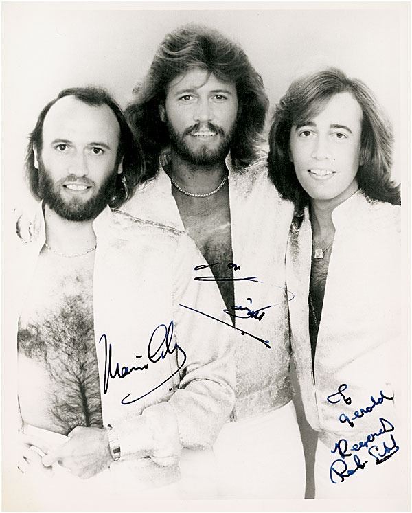 Satin-finish 8 x 10 group photo of the Bee Gees, signed and inscribed in black ink, “To Gerald, Regards, Robin Gibb,” “Maurice Gibb,” and “Barry.” In fine condition, with trivial toning.