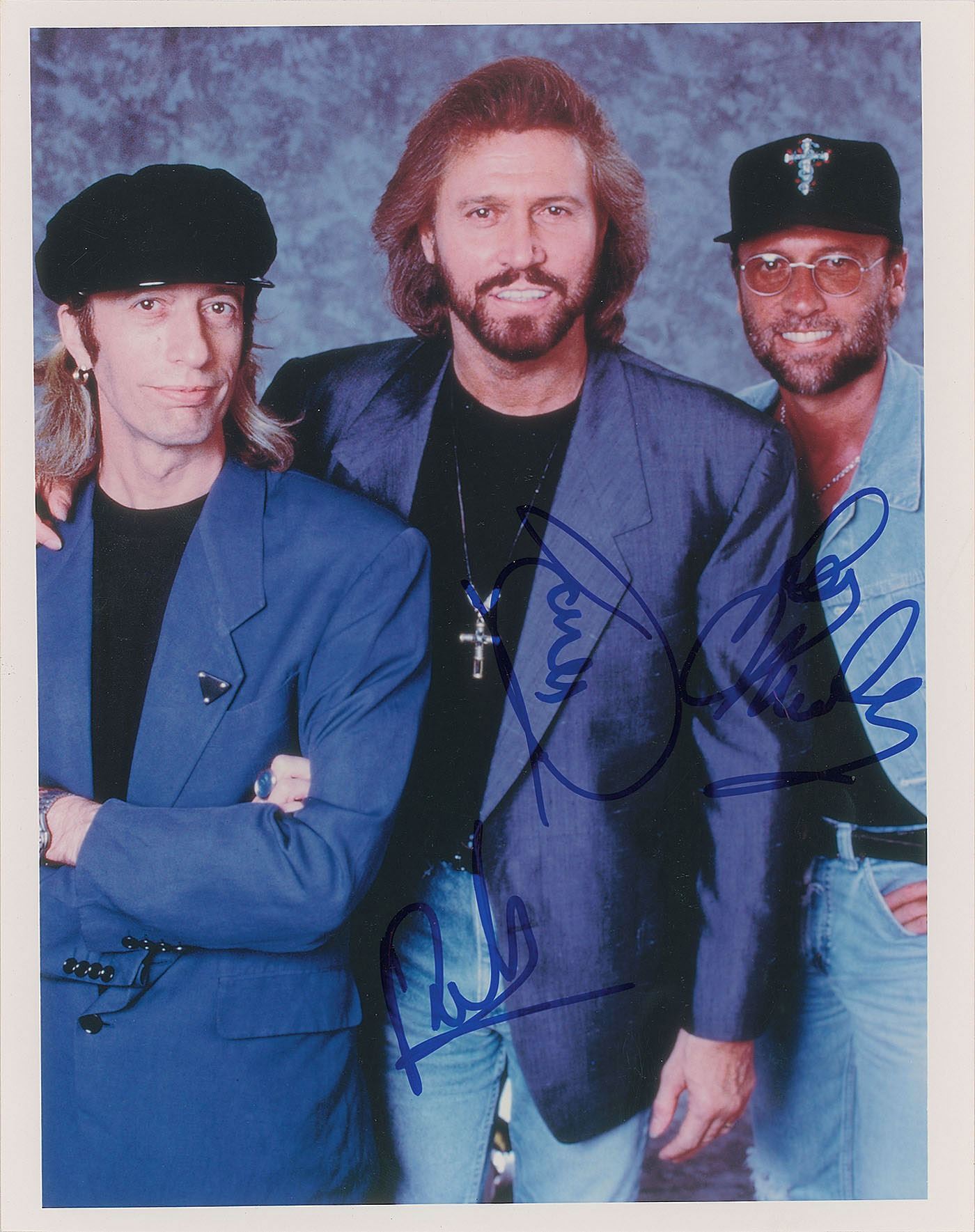 Color glossy 8 x 10 photo of the Bee Gees, signed in blue felt tip by Robin, Barry, and Maurice Gibb. In fine condition.