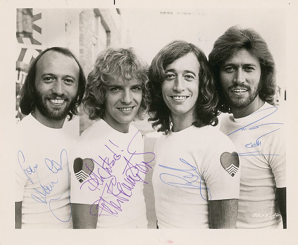 Glossy 10 x 8 photo of the Gibbs posing together with Frampton, signed in-person in blue ballpoint by Barry, Robin, and Maurice Gibb, and in purple felt tip by Peter Frampton. In very good condition, with scattered surface marks and impressions and a diagonal crease along bottom portion of image.