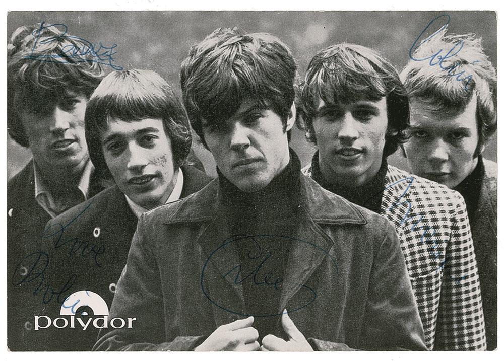 Vintage promotional 5.75 x 4 Polydor Records cardstock photo, signed in blue ballpoint by Barry, Robin, and Maurice Gibb, as well as Colin Petersen and Vince Melouney, all signing first names only. Light contrast to Robin’s and Maurice ’s signatures, and a small postal impression to top right, otherwise fine condition.