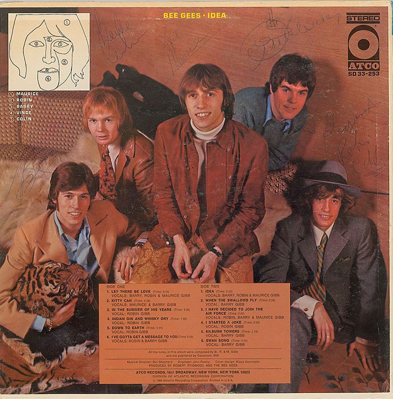 Idea album signed on the reverse in ballpoint by Barry Gibb, Robin Gibb, Maurice Gibb, Vince Melouney, and Colin Petersen. In fine condition, with a small split to the top edge. The record is included.